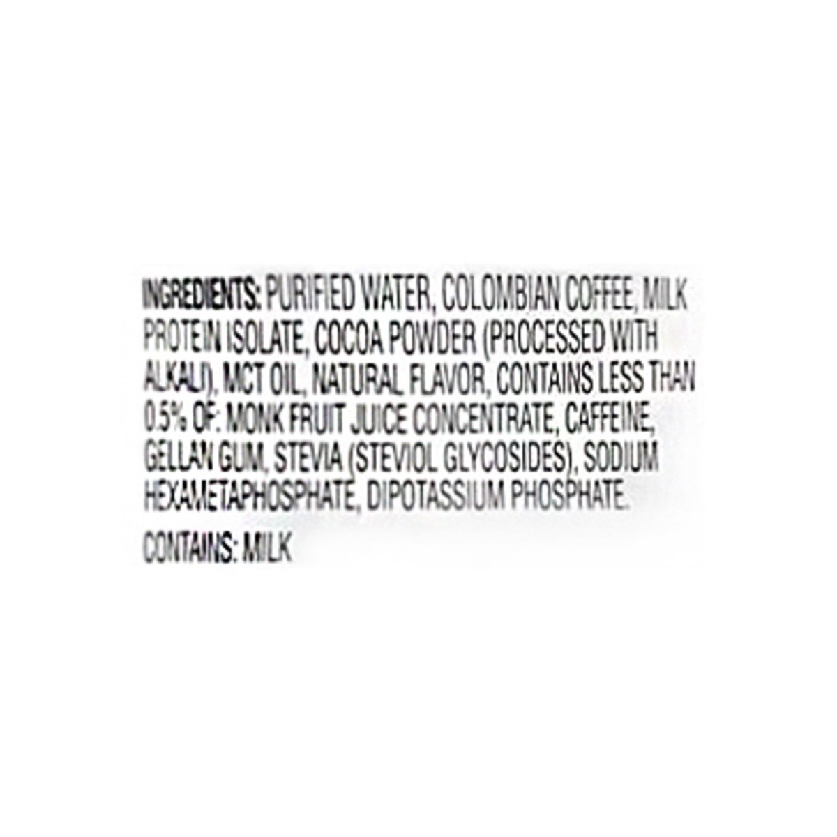 Purified Water, Colombian Coffee, Milk Protein Isolate, Cocoa Powder (Processed with Alkali), MCT Oil, Natural Flavor, Contains Less than 0.5% of: Monk Fruit Juice Concentrate, Caffeine, Gellan Gum, S…