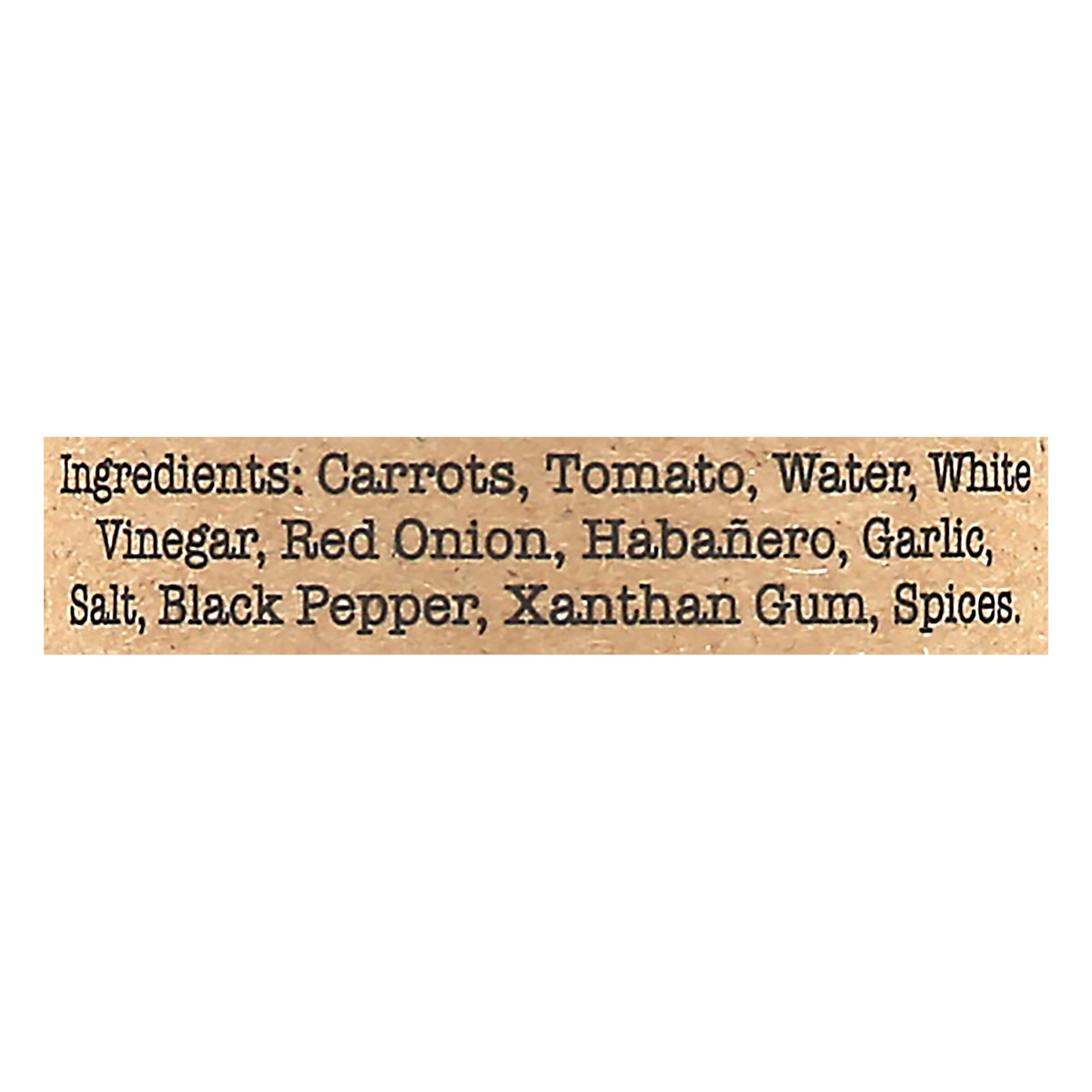 Carrots, Tomato, Water, White Vinegar, Red Onion, Habanero, Garlic, Salt, Black Pepper, Xanthan Gum, Spices.