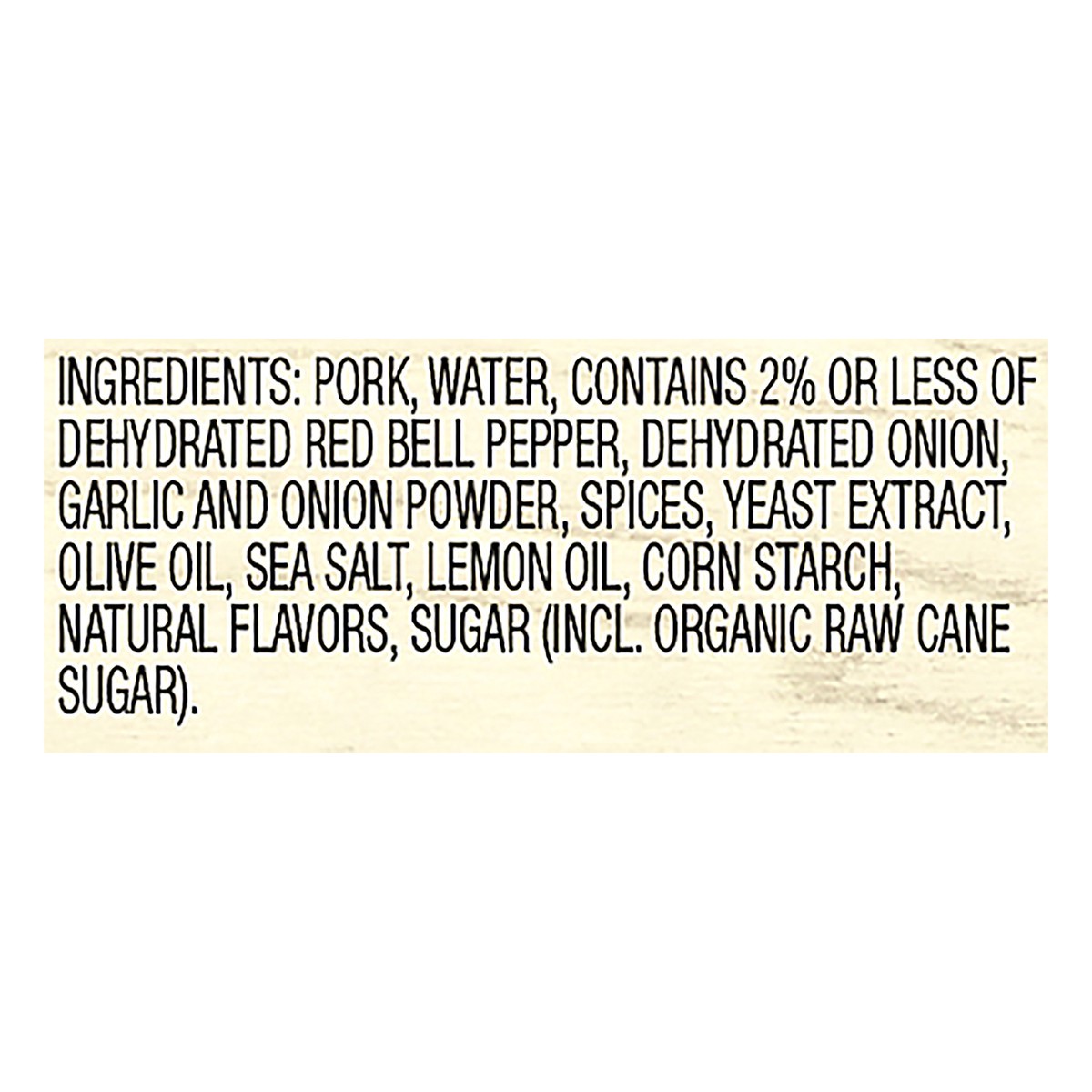 Pork, Water, Contains 2% or Less of Dehydrated Red Bell Pepper, Dehydrated Onion, Garlic and Onion Powder, Spices, Yeast Extract Olive Oil, Sea Salt, Lemon Oil, Corn Starch, Natural Flavors, Sugar (In…