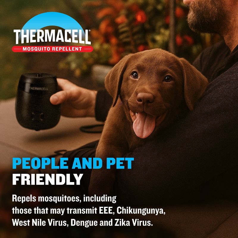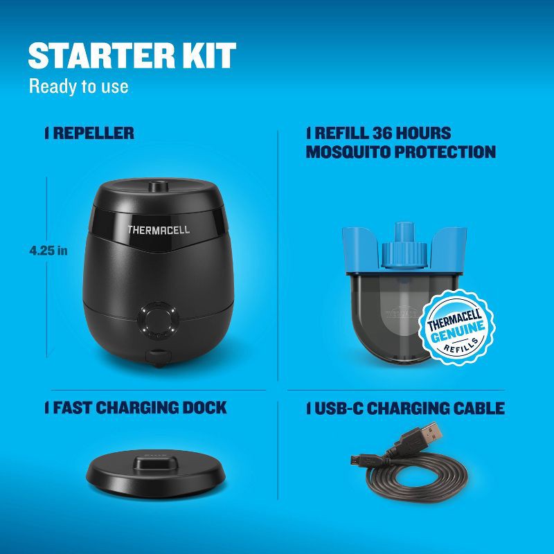 - SCIENTIFICALLY PROVEN MOSQUITO PROTECTION: Thermacell is tested and proven to repel mosquitoes from a 20FT zone. Trusted by outdoor experts to work on the outdoor patio and beyond for over 25 years. This convenient starter pack comes complete with a repeller, fast-charging dock, and 36 hours of Deet-free refill. Packaging may vary.