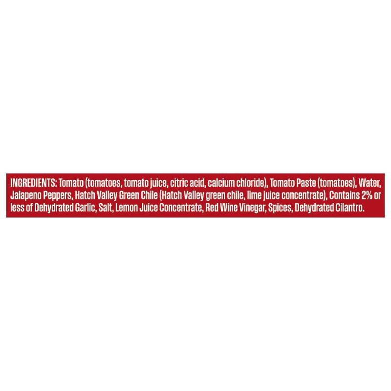 Tomato (Tomatoes, Tomato Juice, Citric Acid, Calcium Chloride), Tomato Paste (Tomatoes), Water, Jalapeno Peppers, Hatch Valley Green Chile (Hatch Valley Green Chile, Lime Juice Concentrate), Contains …