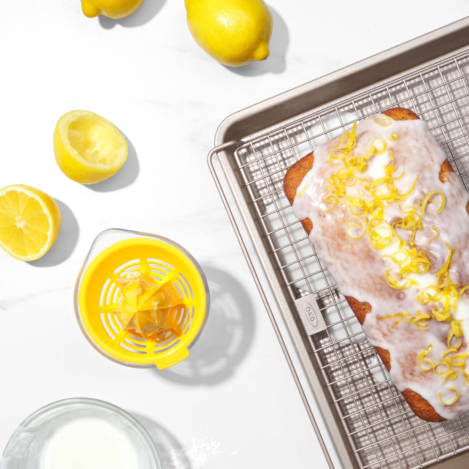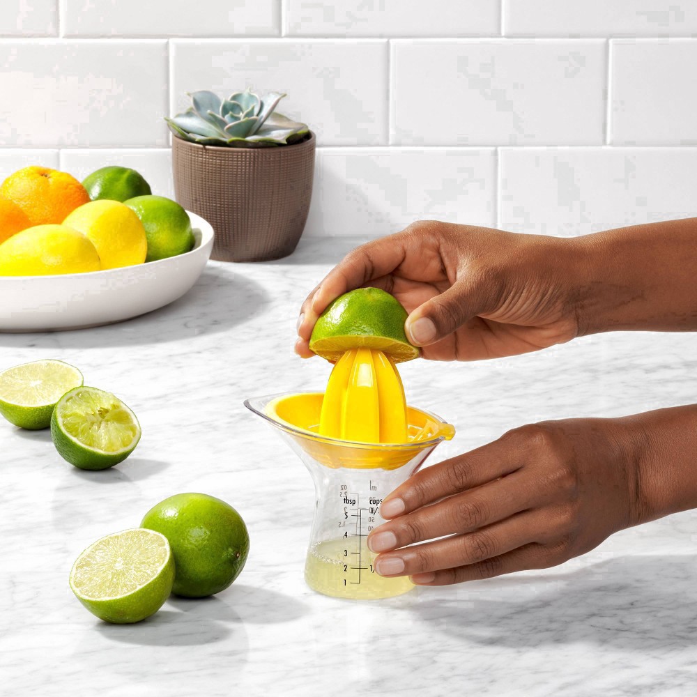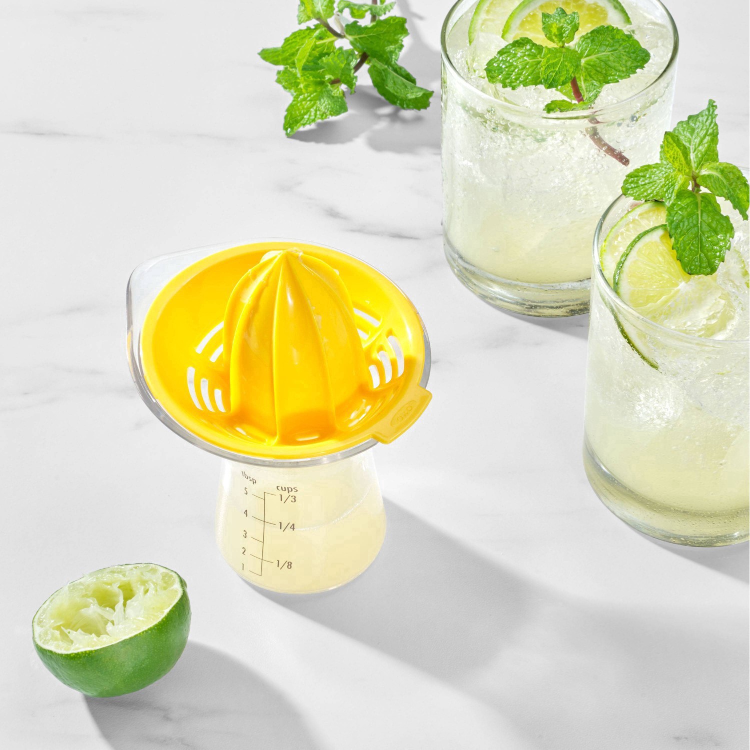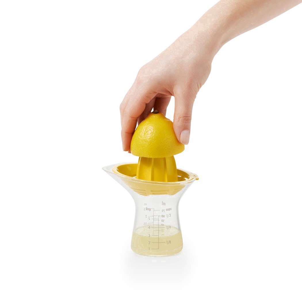 Sized for measuring citrus juice for cooking and baking. Unique reamer design for easy and efficient juicing. Drip-free pour spout. Disassembles for cleaning. Dishwasher safe.