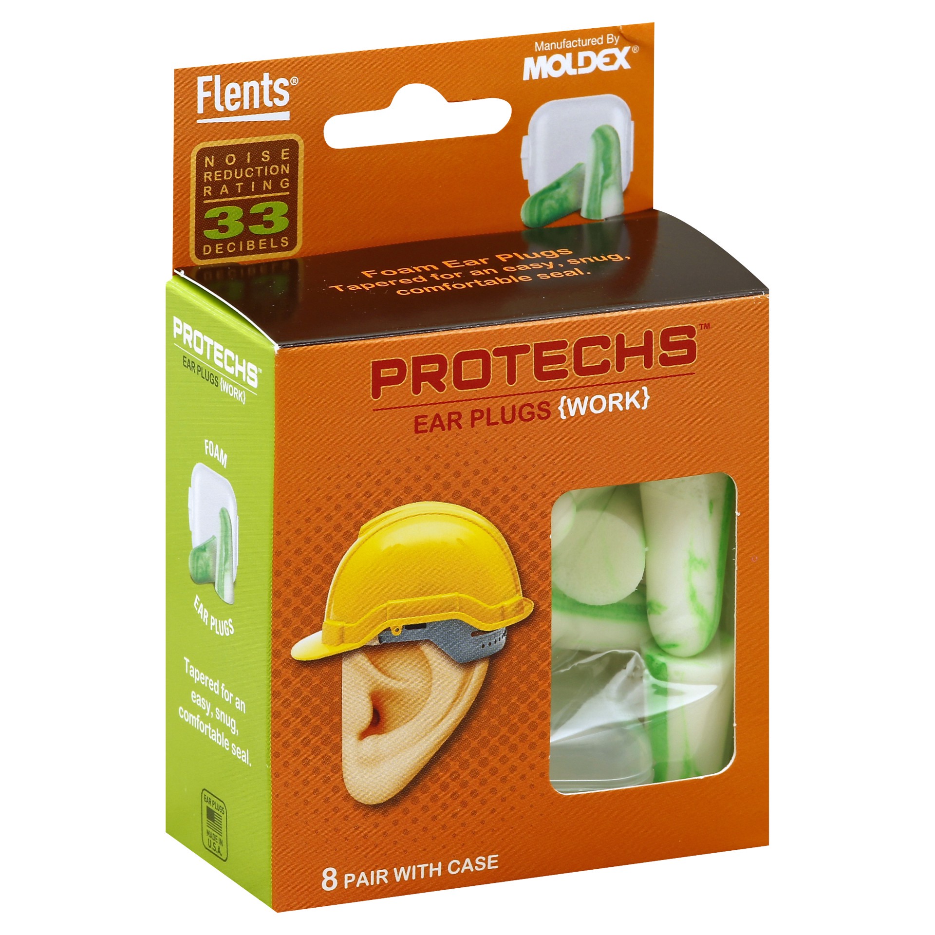 With case. Noise Reduction Rating: 33 decibels. Foam air plugs. Tapered for an easy, snug, comfortable seal. Information Required by EPA: The level of noise entering a person's ear, when a hearing pro…