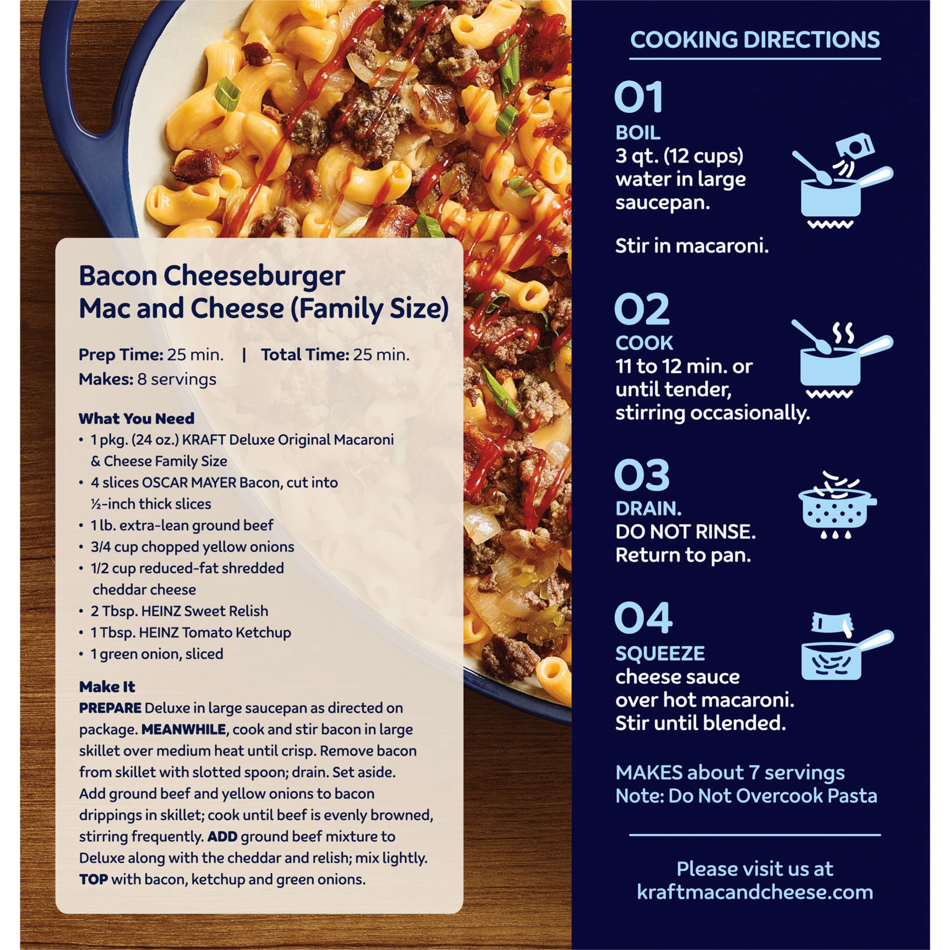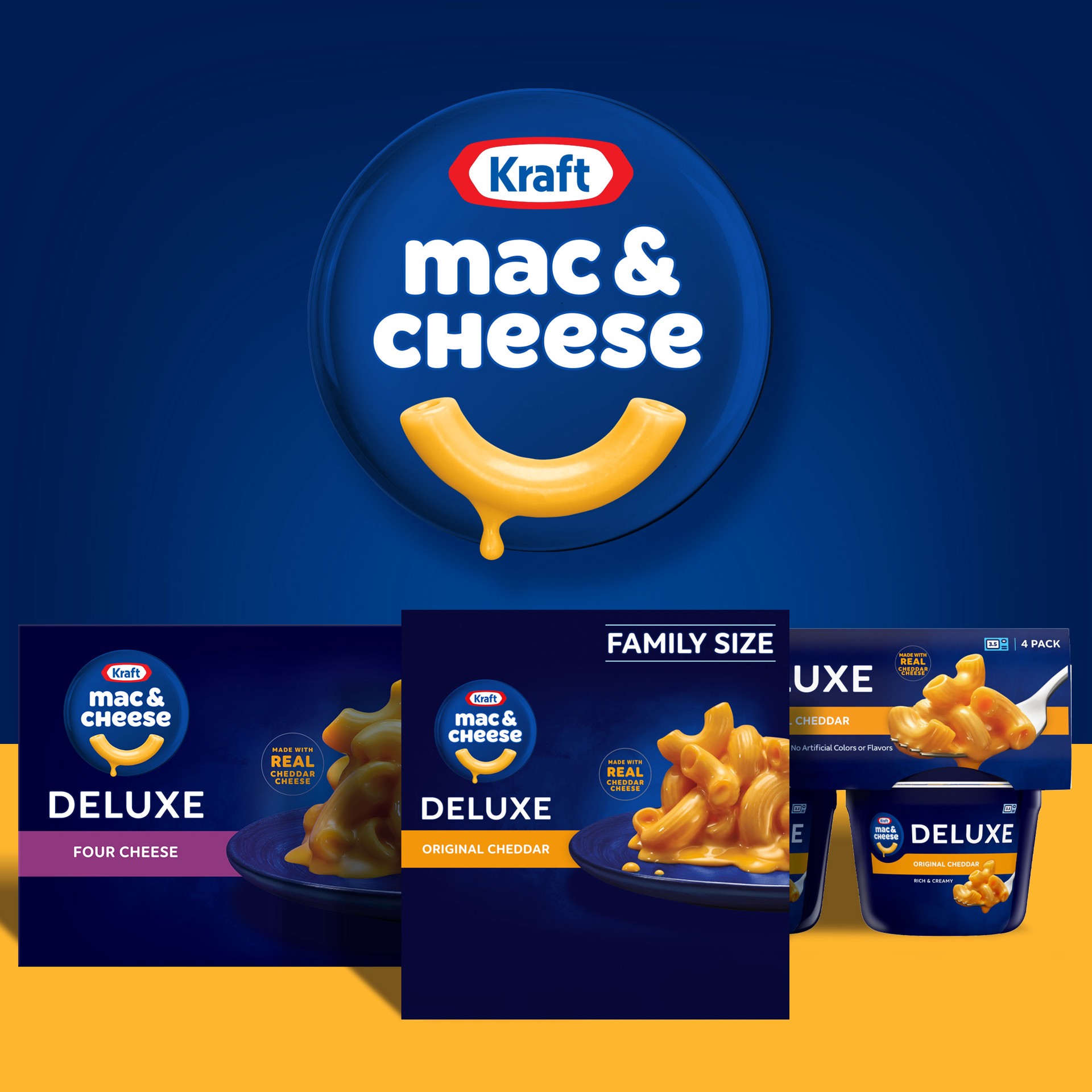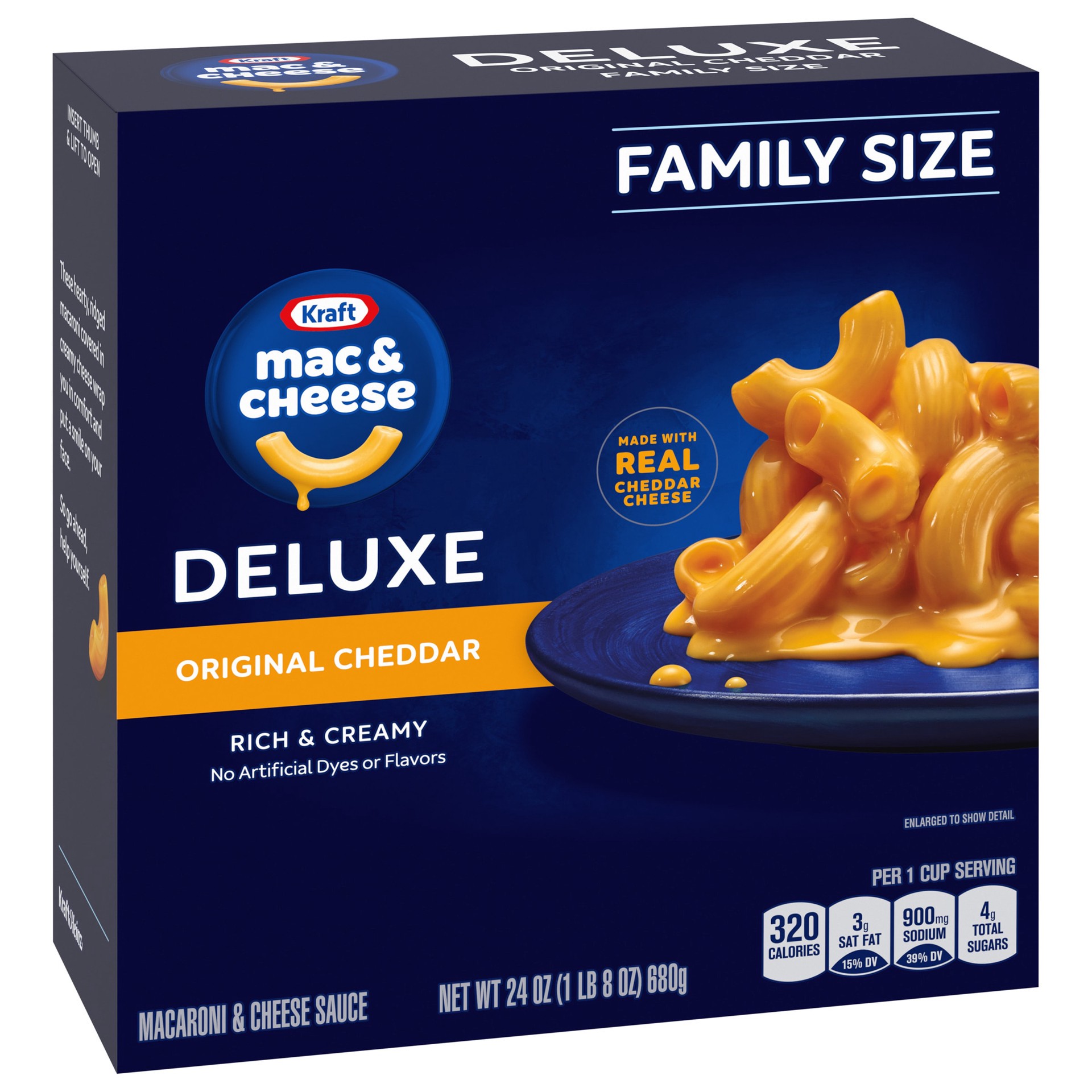 Serve everyone in the family a bowl of comfort with Kraft Deluxe Original Cheddar Macaroni & Cheese Dinner Family Size Box. Rich and creamy, our dinner is made with ridge macaroni and real cheese sauc…