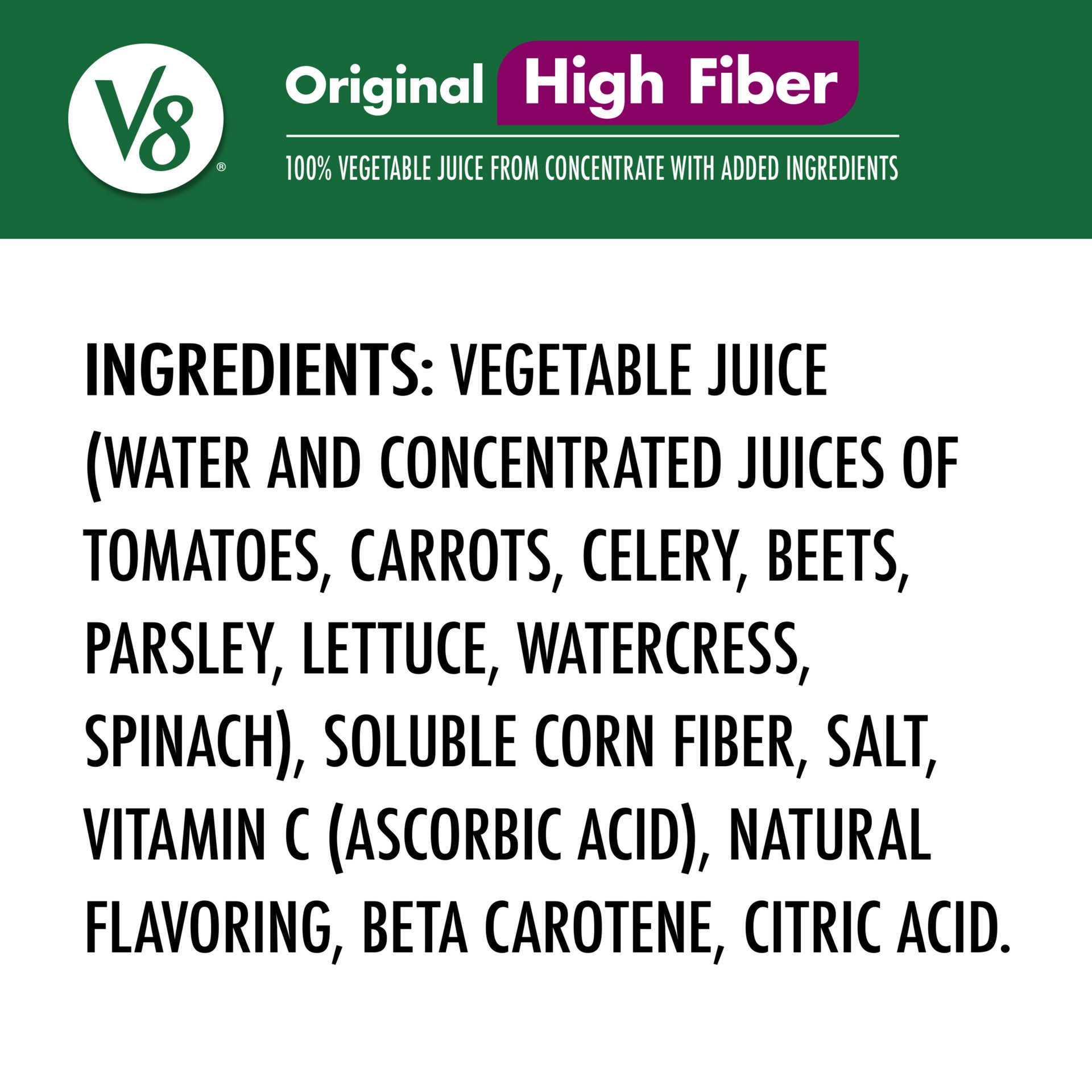 Savor the plant based goodness of V8 High Fiber Original 100% Vegetable Juice. A satisfying alternative to other juices, this high fiber V8 juice is made with concentrated tomato juice along with the …