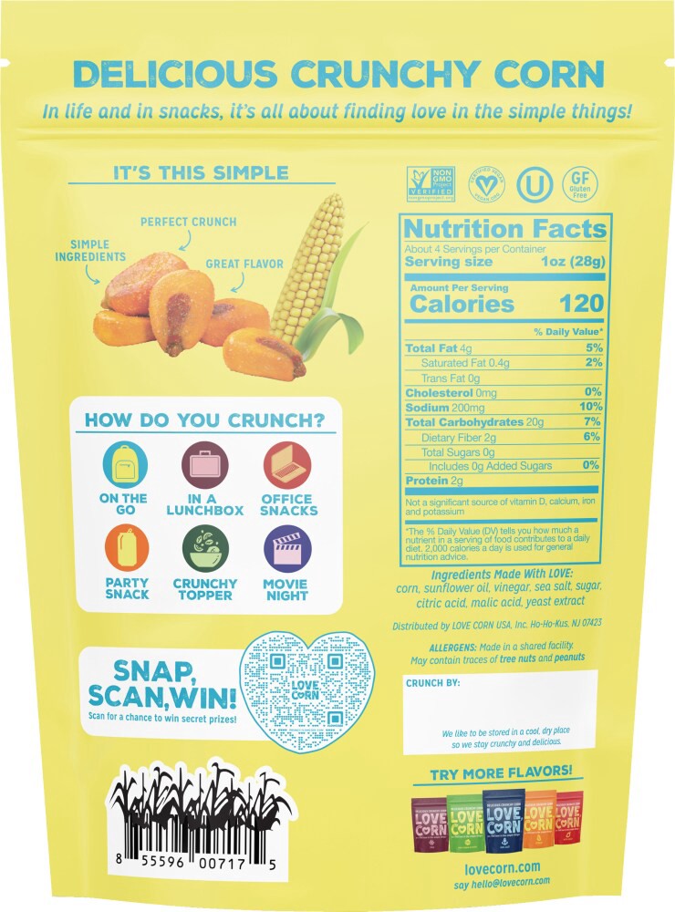 LOVE CORN’s delicious crunchy corn kernels are made with simple ingredients & bold flavors the whole family loves!•Dietary Needs: Non-GMO Project Verified, Vegan, Kosher•Form: Kernels•State of Readine…