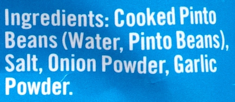 Cooked Pinto Beans (Water, Pinto Beans), Salt, Onion Powder, Garlic Powder.