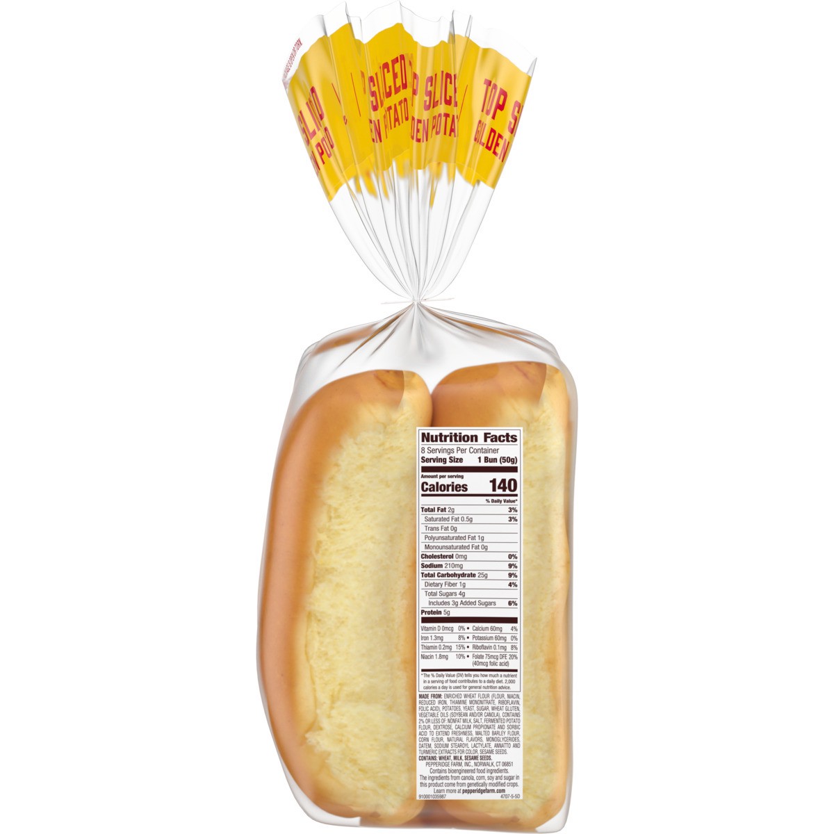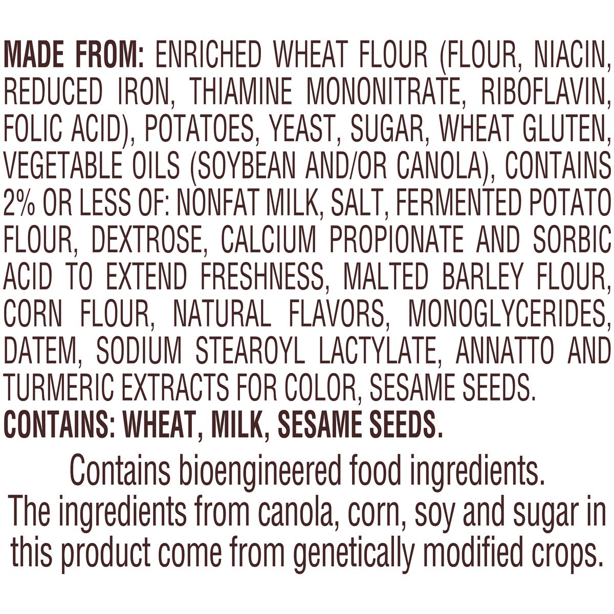 MADE FROM: ENRICHED WHEAT FLOUR (FLOUR, NIACIN, REDUCED IRON, THIAMINE MONONITRATE, RIBOFLAVIN, FOLIC ACID), POTATOES, YEAST, SUGAR, WHEAT GLUTEN, VEGETABLE OILS (SOYBEAN AND/OR CANOLA), CONTAINS 2% O…