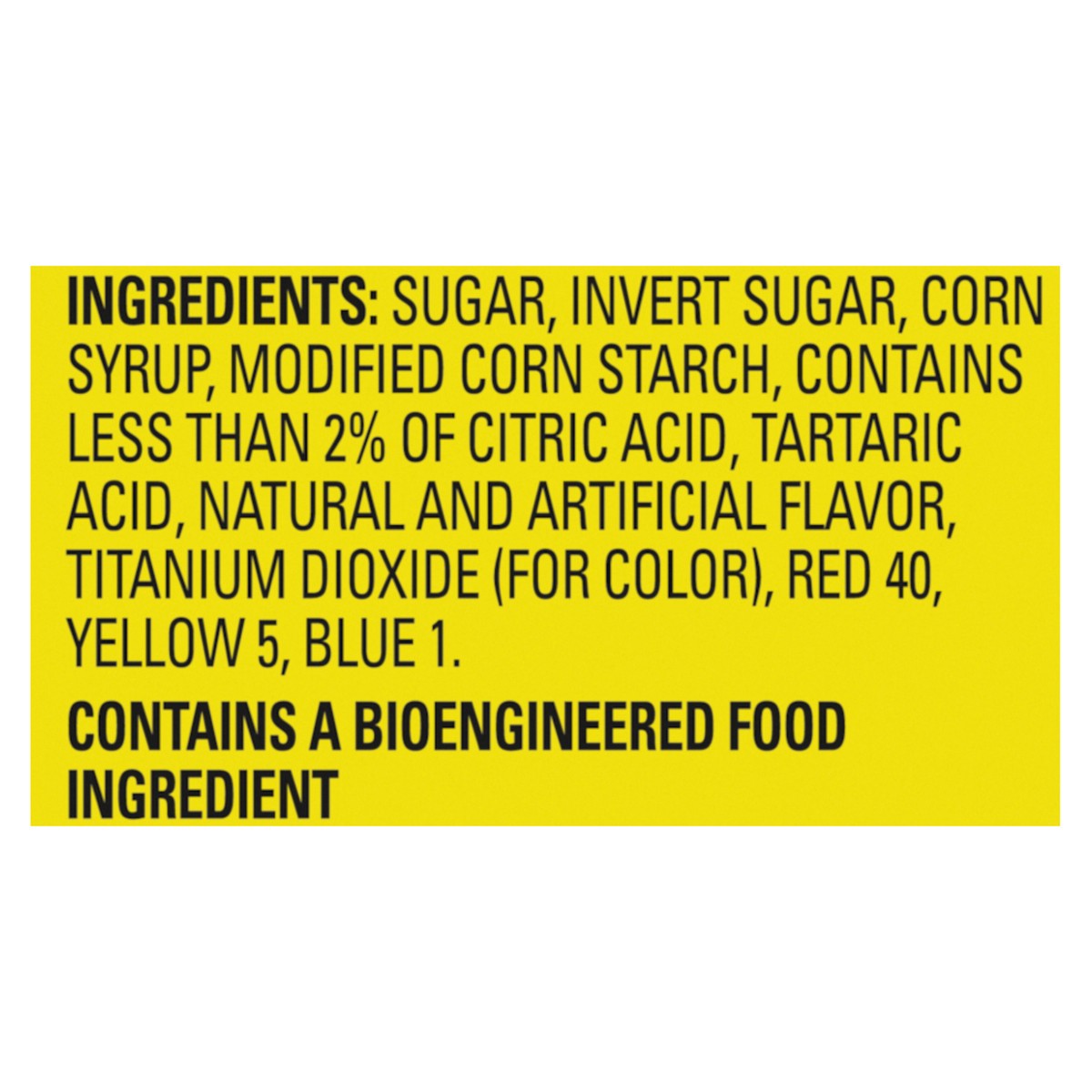 Sugar, Invert Sugar, Corn Syrup, Modified Corn Starch, Contains Less than 2% of Citric Acid, Tartaric Acid, Natural and Artificial Flavor, Titanium Dioxide (for Color), Red 40, Yellow 5, Blue 1.