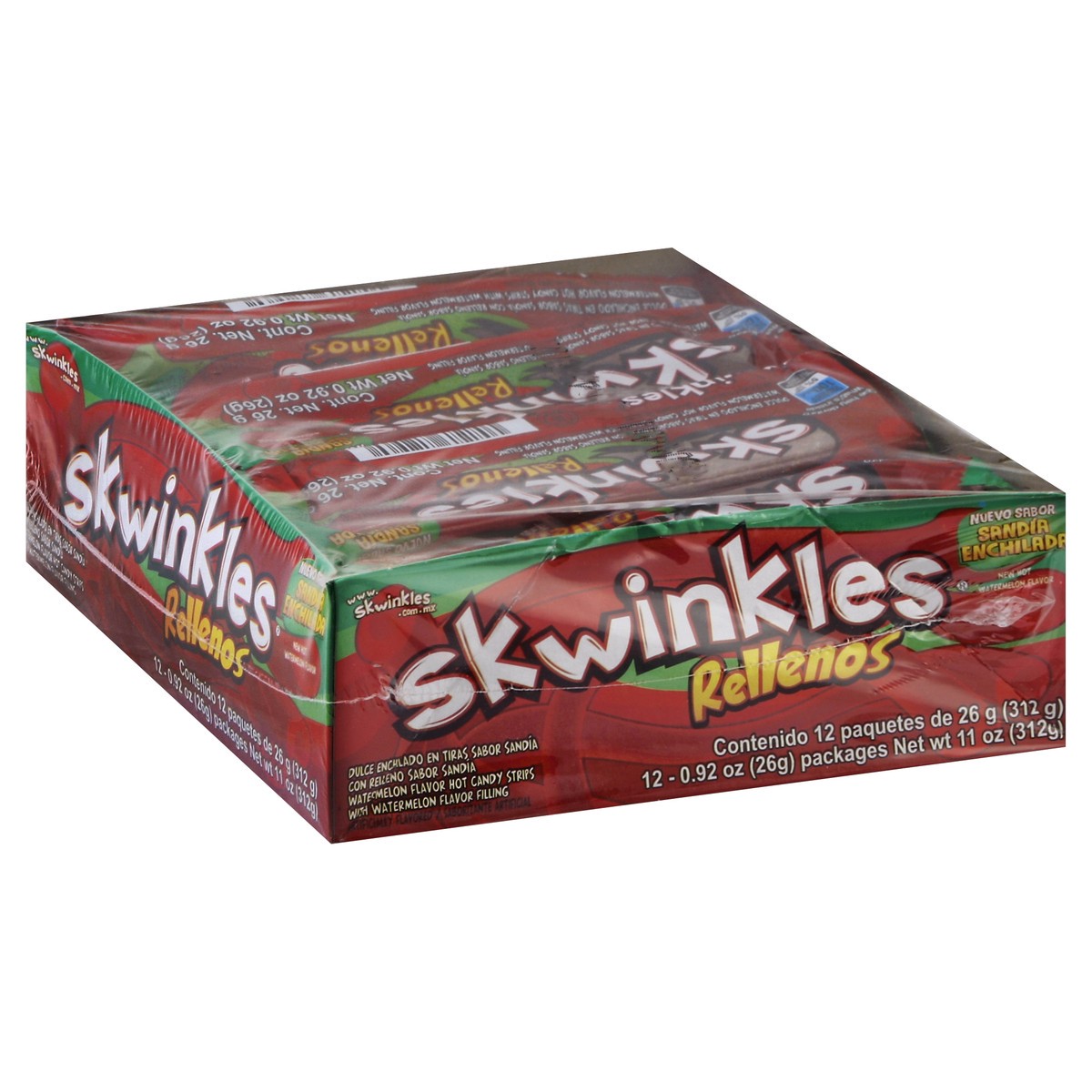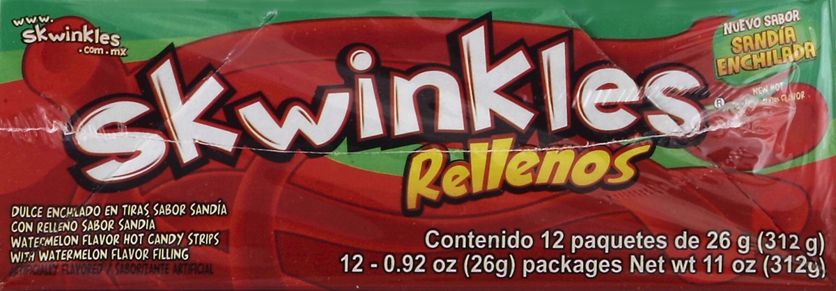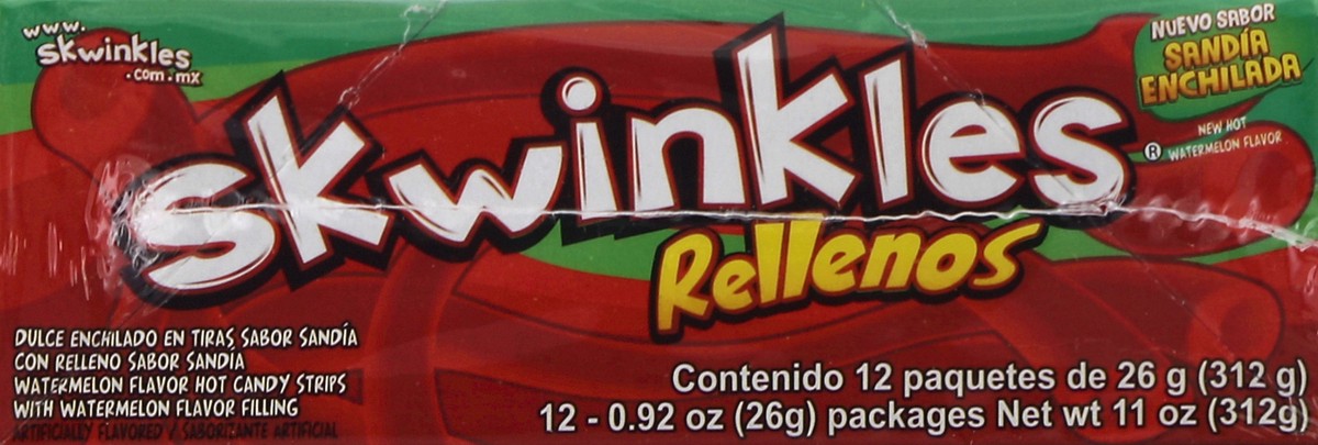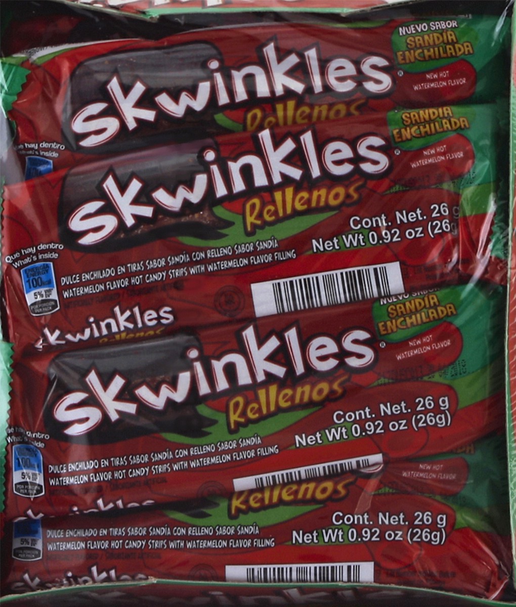 Watermelon flavor hot candy strips with watermelon flavor filling. Artificially flavored. New hot watermelon flavor. www.swinkles.com.mx. For Nutritional Information: USA 1-866-58Lucas. Made in Mexico…