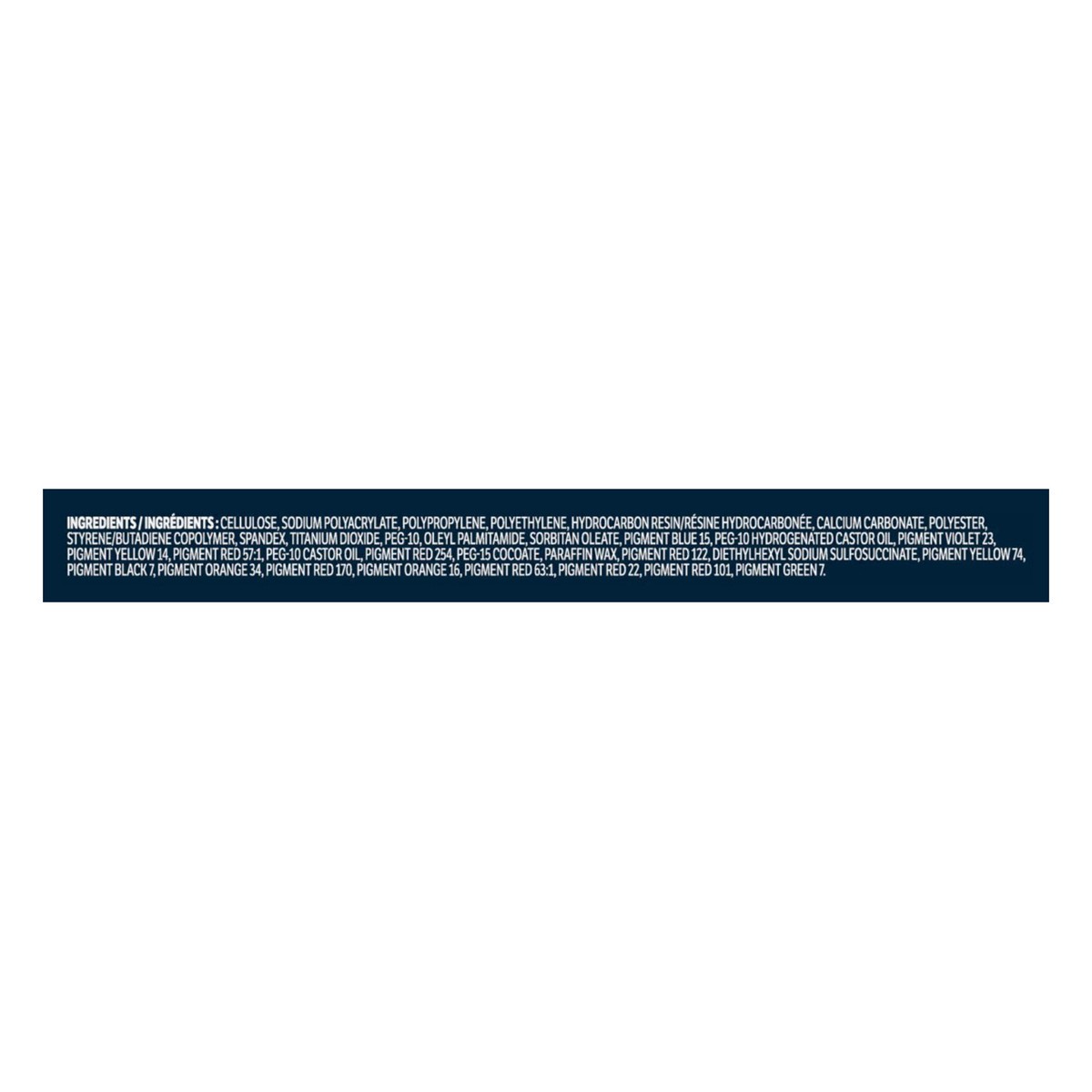 Cellulose, Sodium Polyacrylate, Polypropylene, Polyethylene, Hydrocarbon Resin/Resine Hydrocarbonee, Calcium Carbonate, Polyester, Styrene/Butadiene Copolymer, Spandex, Titanium Dioxide, PEG-10, Oleyl…