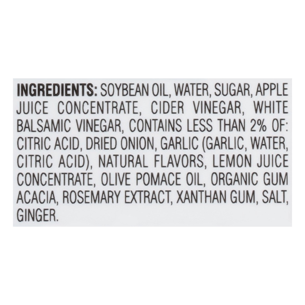 Soybean Oil, Water, Sugar, Apple Juice Concentrate, Cider Vinegar, White Balsamic Vinegar, Contains Less than 2% of: Citric Acid, Dried Onion, Garlic (Garlic, Water, Citric Acid), Natural Flavors, Lem…