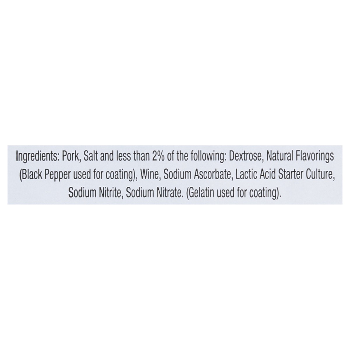 Pork, Salt and Less than 2% of the Following: Dextrose, Natural Flavorings (Black Pepper Used for Coating), Wine, Sodium Ascorbate, Lactic Acid Starter Culture, Sodium Nitrite, Sodium Nitrate, (Gelatiā¦