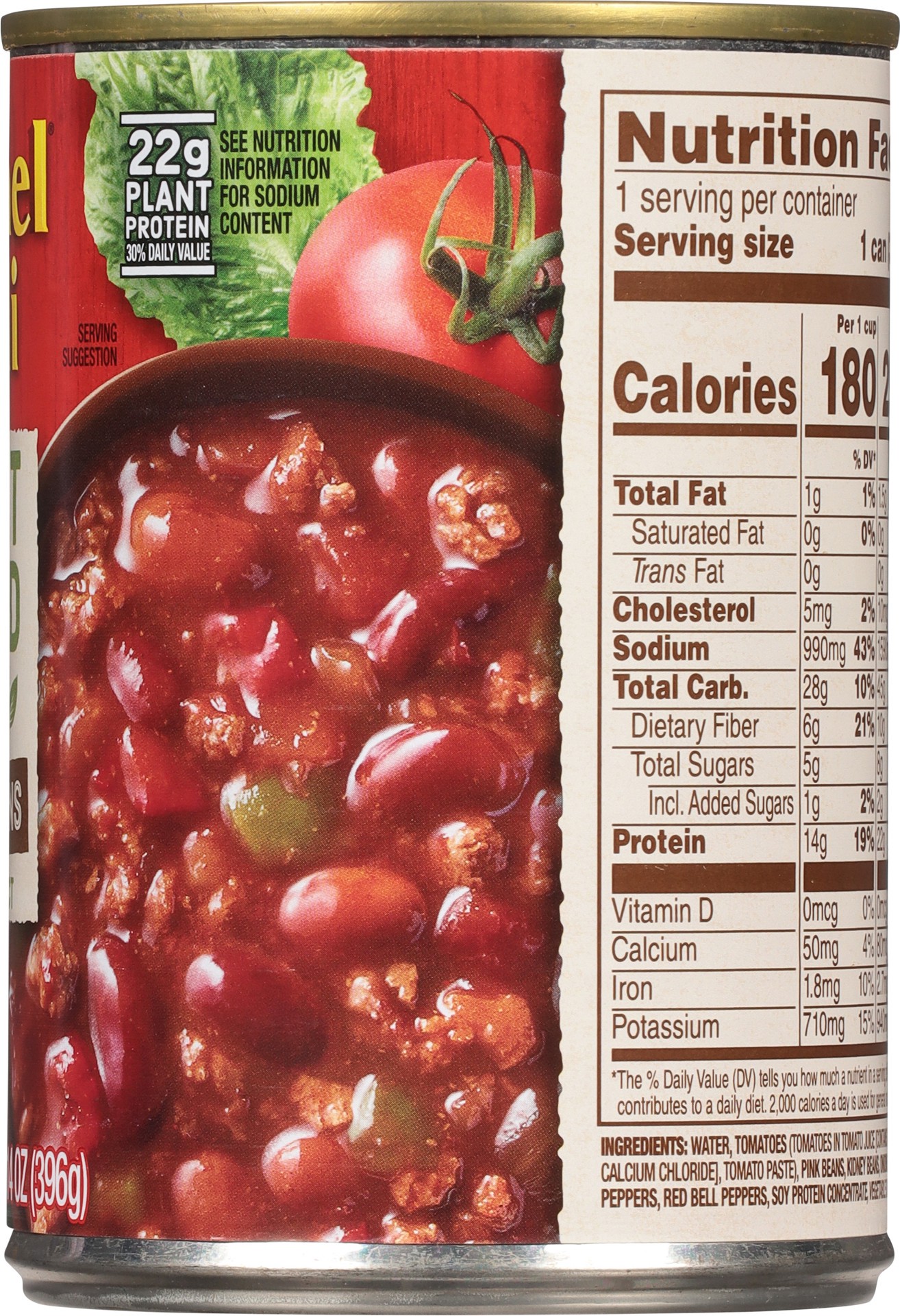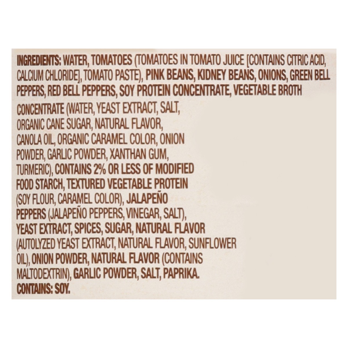 Water, Tomatoes (Tomatoes in Tomato Juice [Contains Citric Acid, Calcium Chloride], Tomato Paste), Pink Beans, Kidney Beans, Onions, Green Bell Peppers, Red Bell Peppers, Soy Protein Concentrate, Vegeā¦