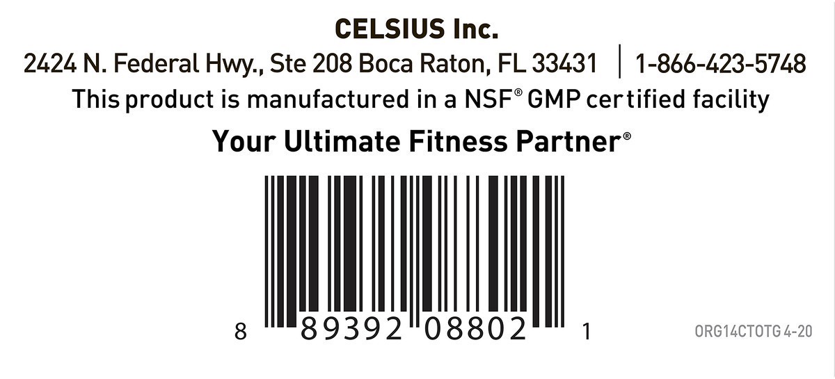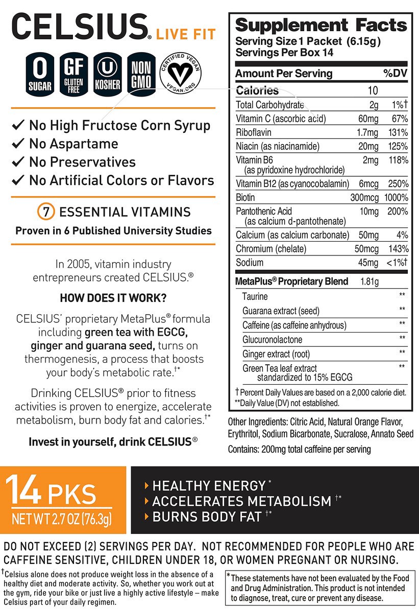 Dietary Supplement 0 sugar. Contains: 200 mg total caffeine per serving. No sugar. Gluten free. Certified Vegan. vegan.org. Non GMO. No preservatives. Healthy energy. Accelerates metabolism (Celsius a…