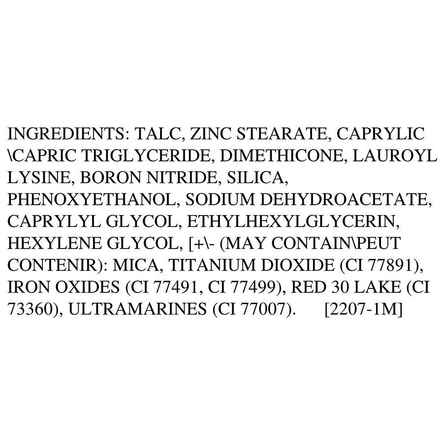 Talc, Zinc Stearate, Caprylic/Capric Triglyceride, Dimethicone, Lauroyl Lysine, Boron Nitride, Silica, Phenoxyethanol, Sodium Dehydroacetate, Caprylyl Glycol, Ethylhexylglycerin, Hexylene Glycol, [+/-…