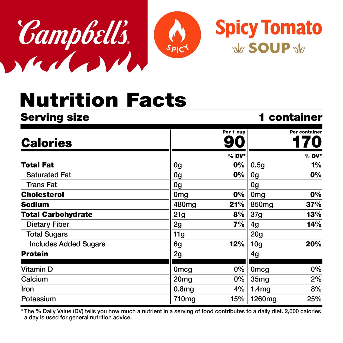 Cozy up with a steamy bowl of Campbell''s Spicy Tomato Soup. A spicy twist on a family favorite, this ready-to-eat tomato soup is crafted with a delicious tomato puree, perfectly balanced spices and c…