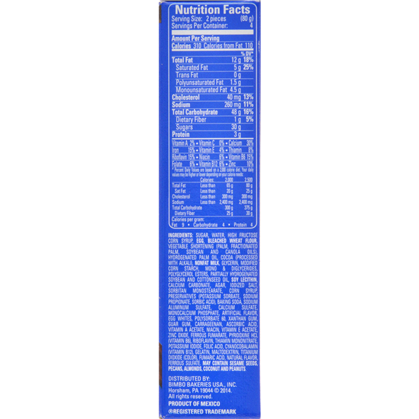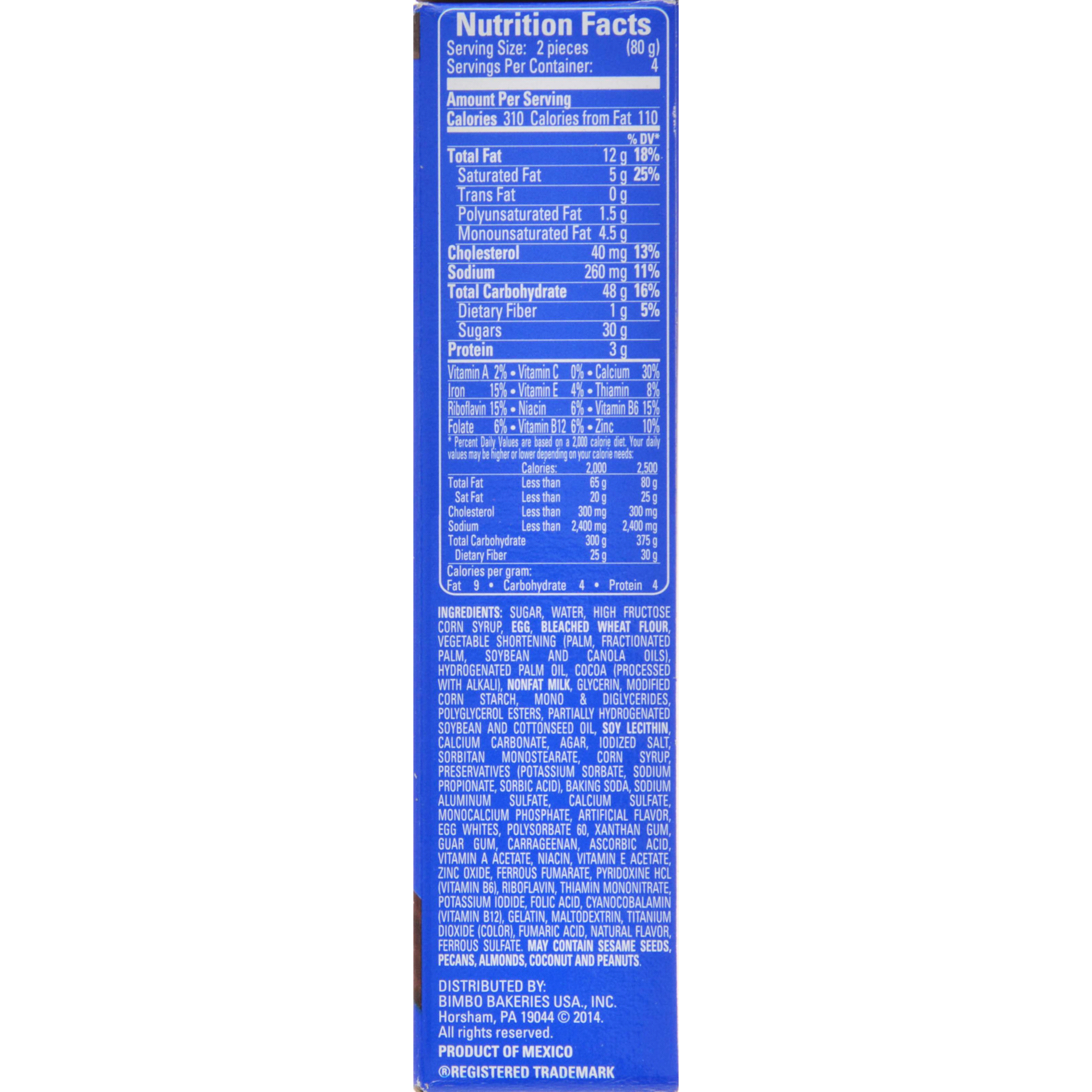 Sugar, Water, Eggs, Bleached Wheat Flour, Invert Sugar, Vegetable Shortening (Palm, Soybean Oils), Glycerin, Cocoa (Processed with Alkali), Vegetable Oil (Canola, Soybean), Nonfat Milk, Food Starch-Mo…
