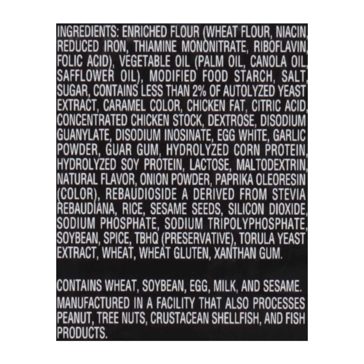 Enriched Flour (Wheat Flour, Niacin Reduced Iron, Thiamine Mononitrate, Riboflavin Folic Acid), Vegetable Oil (Palm Oil, Canola Oil Safflower Oil), Modified Food Starch, Salt, Sugar, Contains Less tha…