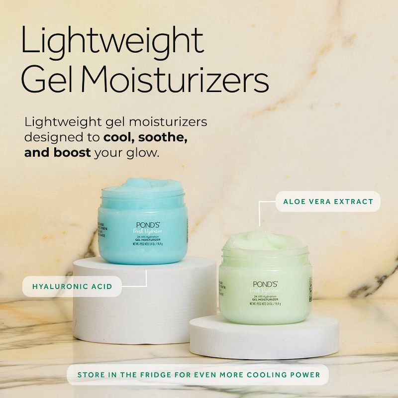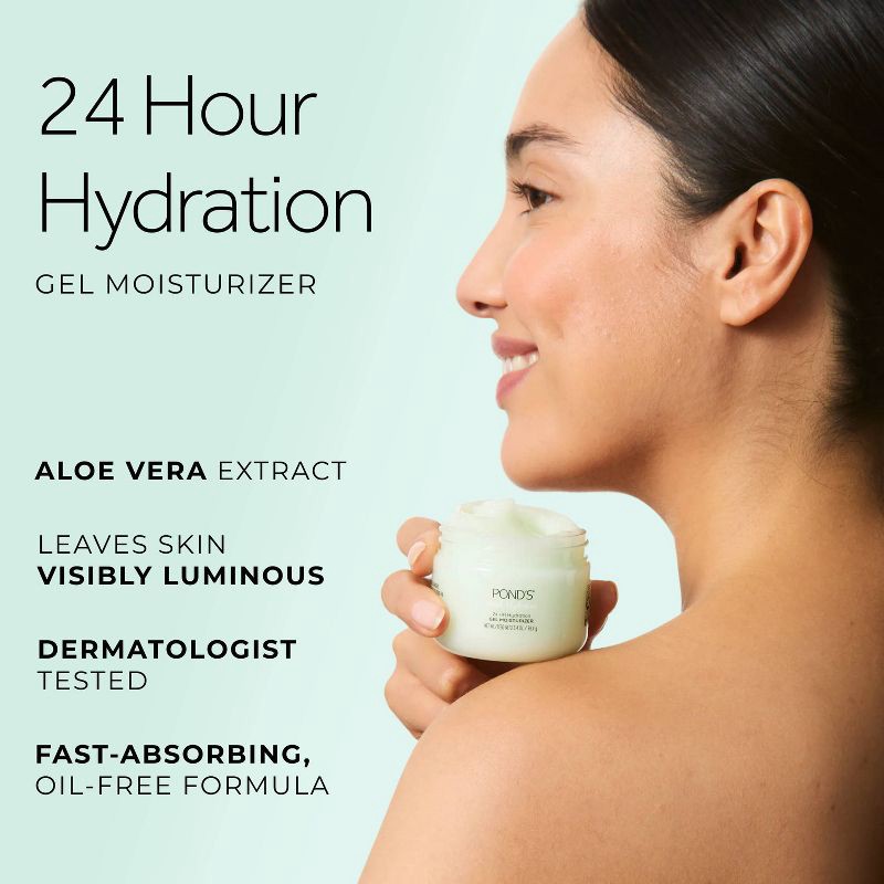 - POND'S GEL MOISTURIZER – Loved for generations, POND'S Aloe Gel delivers 24-hour soothing hydration and leaves skin looking dewy, soft, and luminous, so you can feel confident, day and night