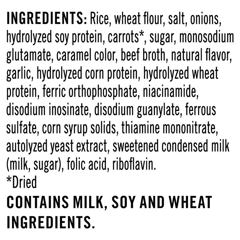 RICE, WHEAT FLOUR, SALT, ONIONS, HYDROLYZED SOY PROTEIN, CARROTS*, SUGAR, MONOSODIUM GLUTAMATE, CARAMEL COLOR, BEEF BROTH, NATURAL FLAVOR, GARLIC, HYDROLYZED CORN PROTEIN, HYDROLYZED WHEAT PROTEIN, FE…