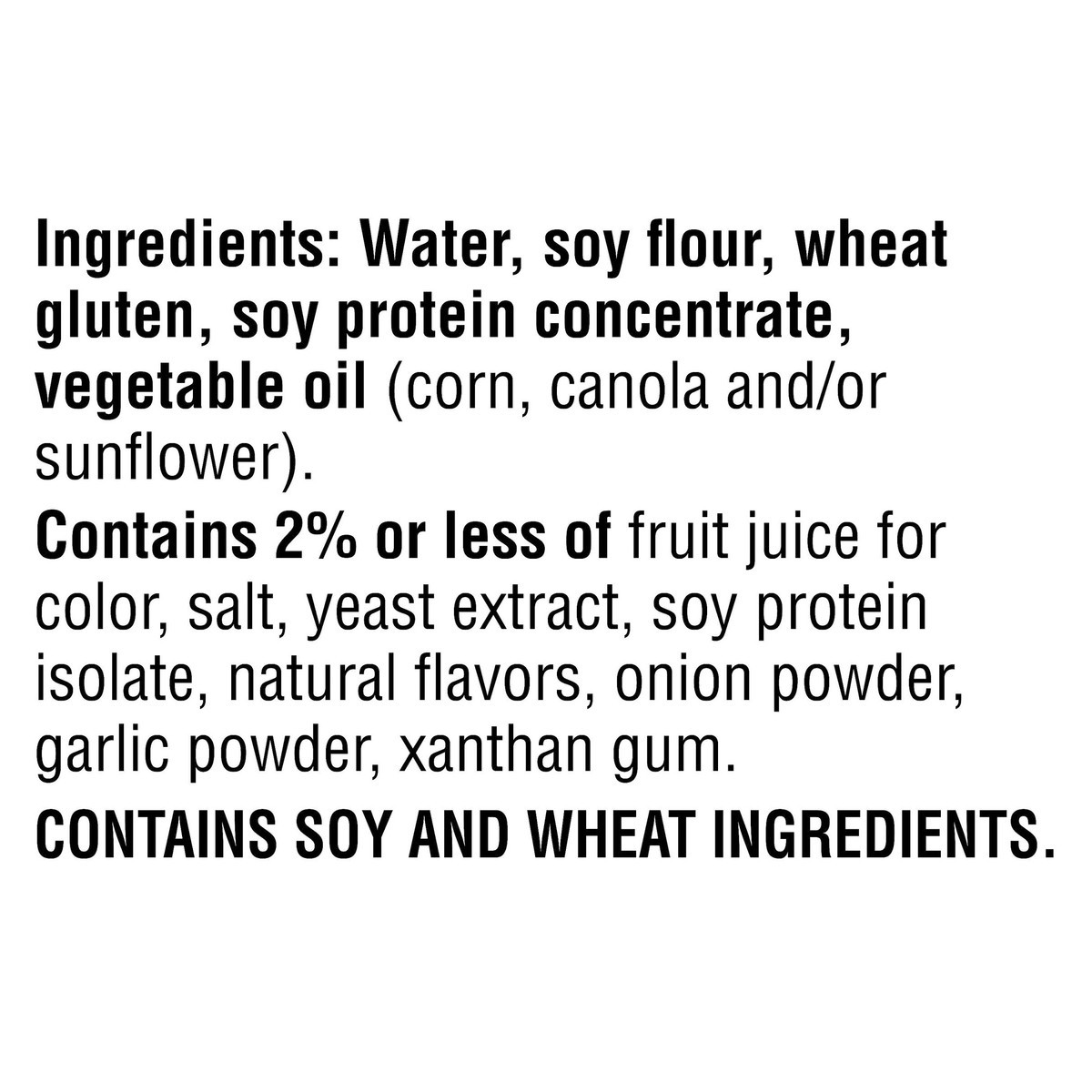 Water, Soy Flour, Wheat Gluten, Soy Protein Concentrate, Vegetable Oil (Corn, Canola and/or Sunflower). Contains 2% or Less of Fruit Juice for Color, Salt, Yeast Extract, Soy Protein Isolate, Natural …