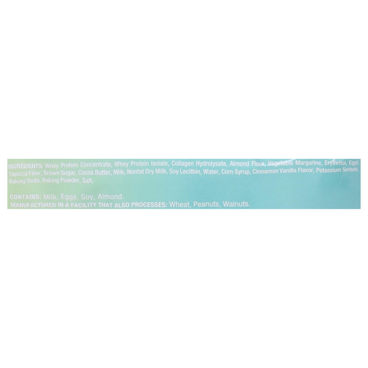 Protein Blend (Collagen Hydrolysate, Whey Protein Concentrate, Whey Protein Isolate), Vegetable Margarine, Erythritol, Eggs, Brown Sugar, Cocoa Butter, Milk, Almond Flour, Potassium Sorbate, Vanilla F…