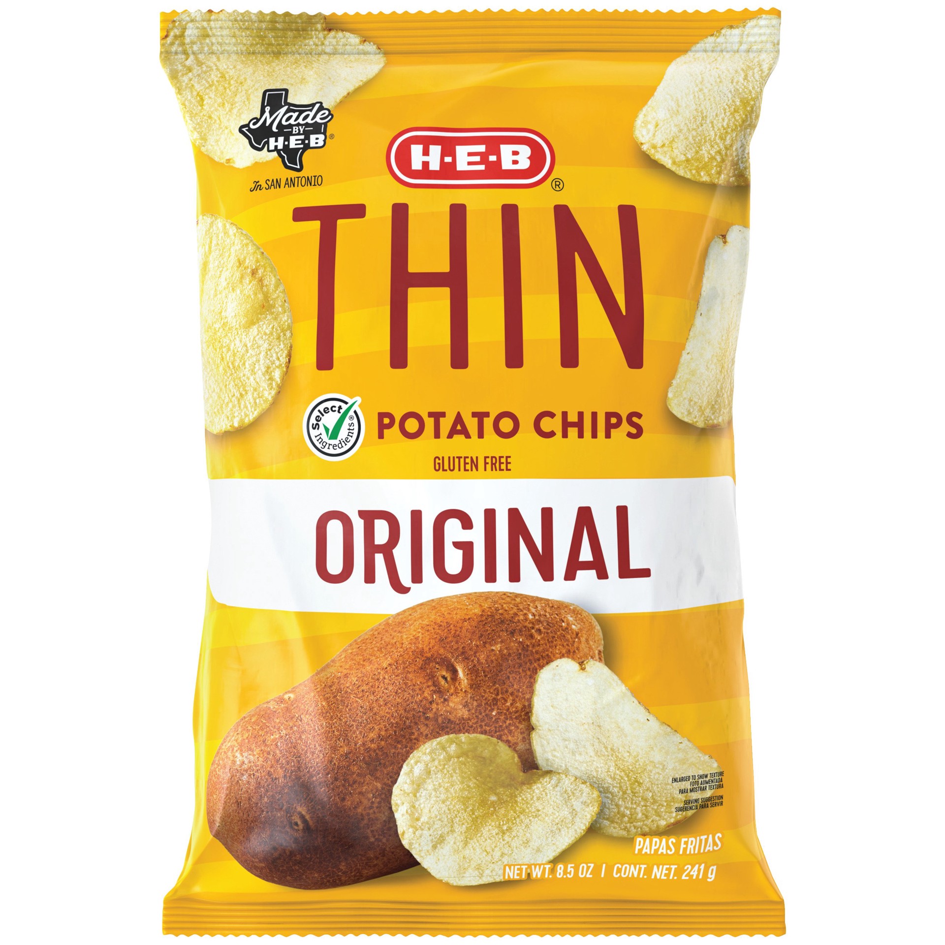 Thin and perfectly crisp, this bag of H-E-B potato chips is a welcome addition to any pantry. Made in San Antonio, they have no artificial flavors or certified synthetic colors. Open up this Original …