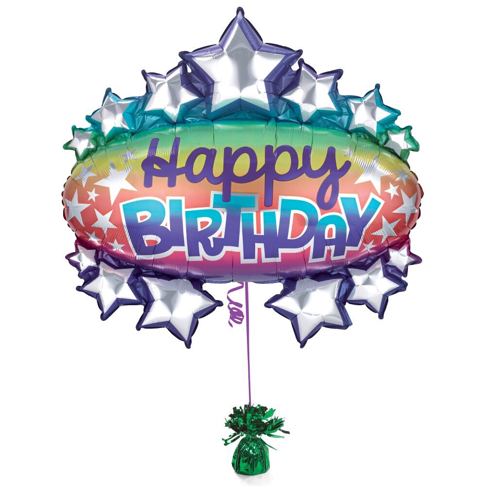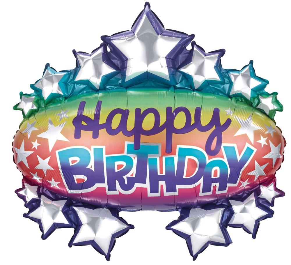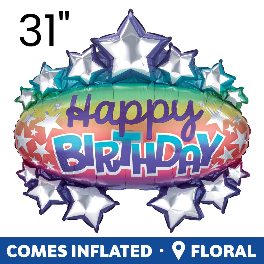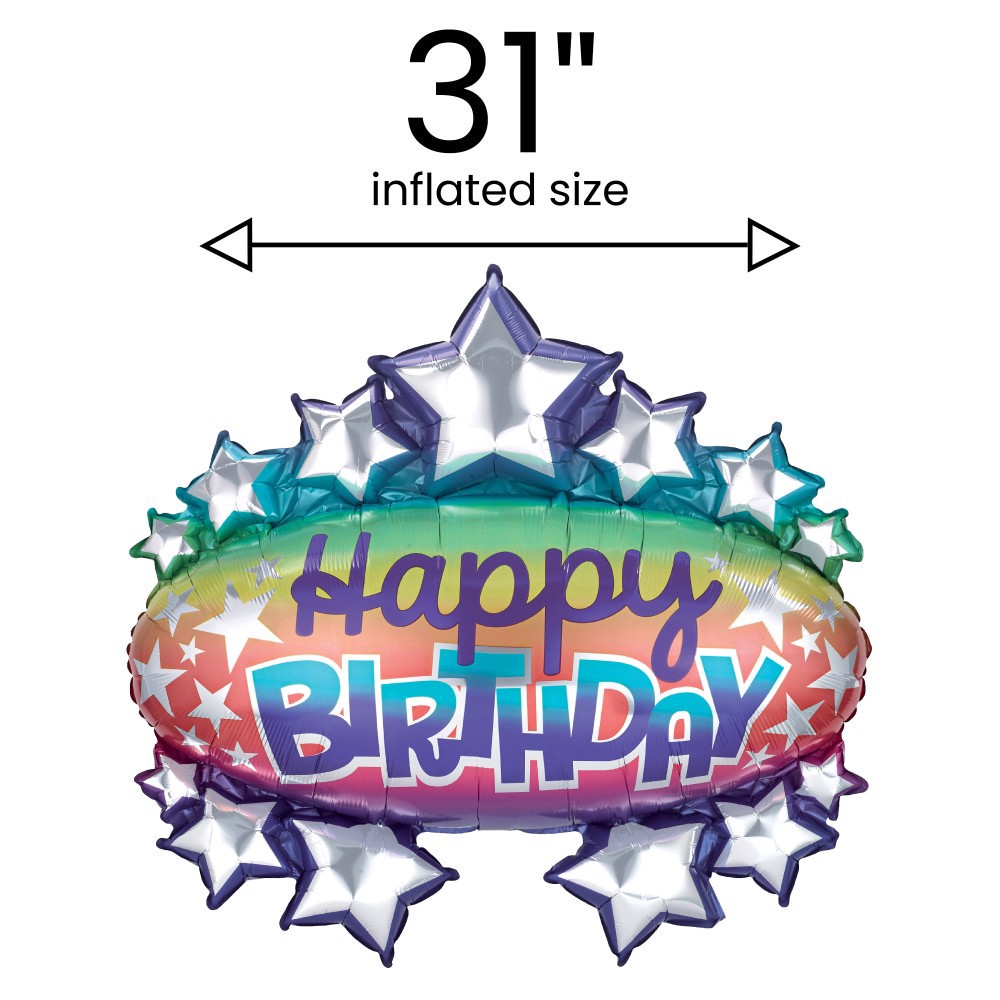 Bring the color to the party! This is a 31 inch marquee shape oversized balloon. It features a bright colored ombre background with silver stars all over and a Happy Birthday message in script and blo…