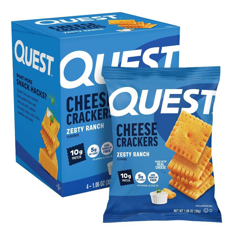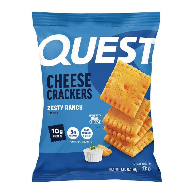 - HACK YOUR SNACK. Quest Zesty Ranch Flavored Cheesy Protein Crackers with 5g of net carbs* bring the consistently bold taste and perfectly crunchy texture that keep you reaching for more.