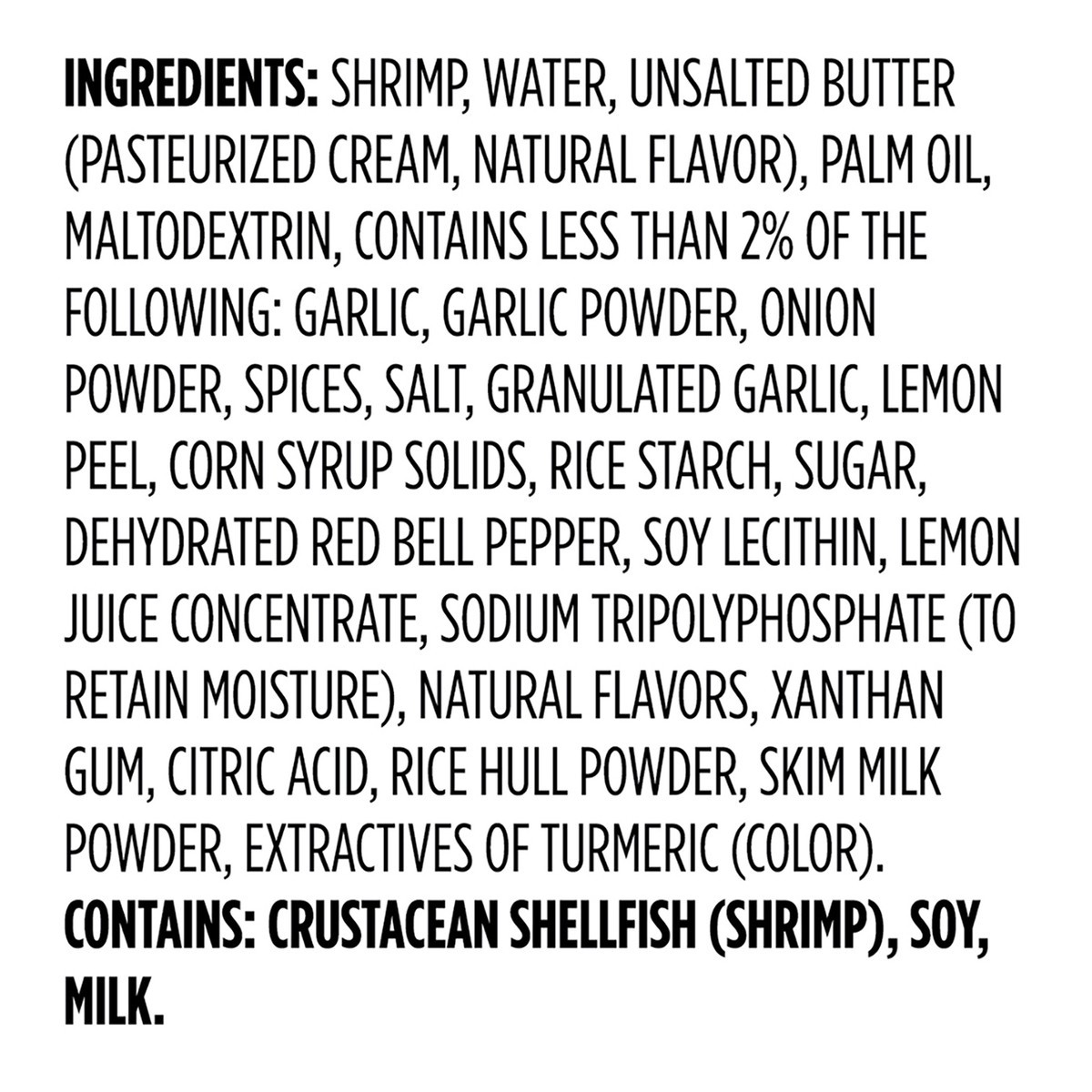 Shrimp, Water, Unsalted Butter (Pasteurized Cream, Natural Flavor), Palm Oil, Maltodextrin, Contains Less than 2% of the Following: Garlic, Garlic Powder, Onion Powder, Spices, Salt, Granulated Garlic…