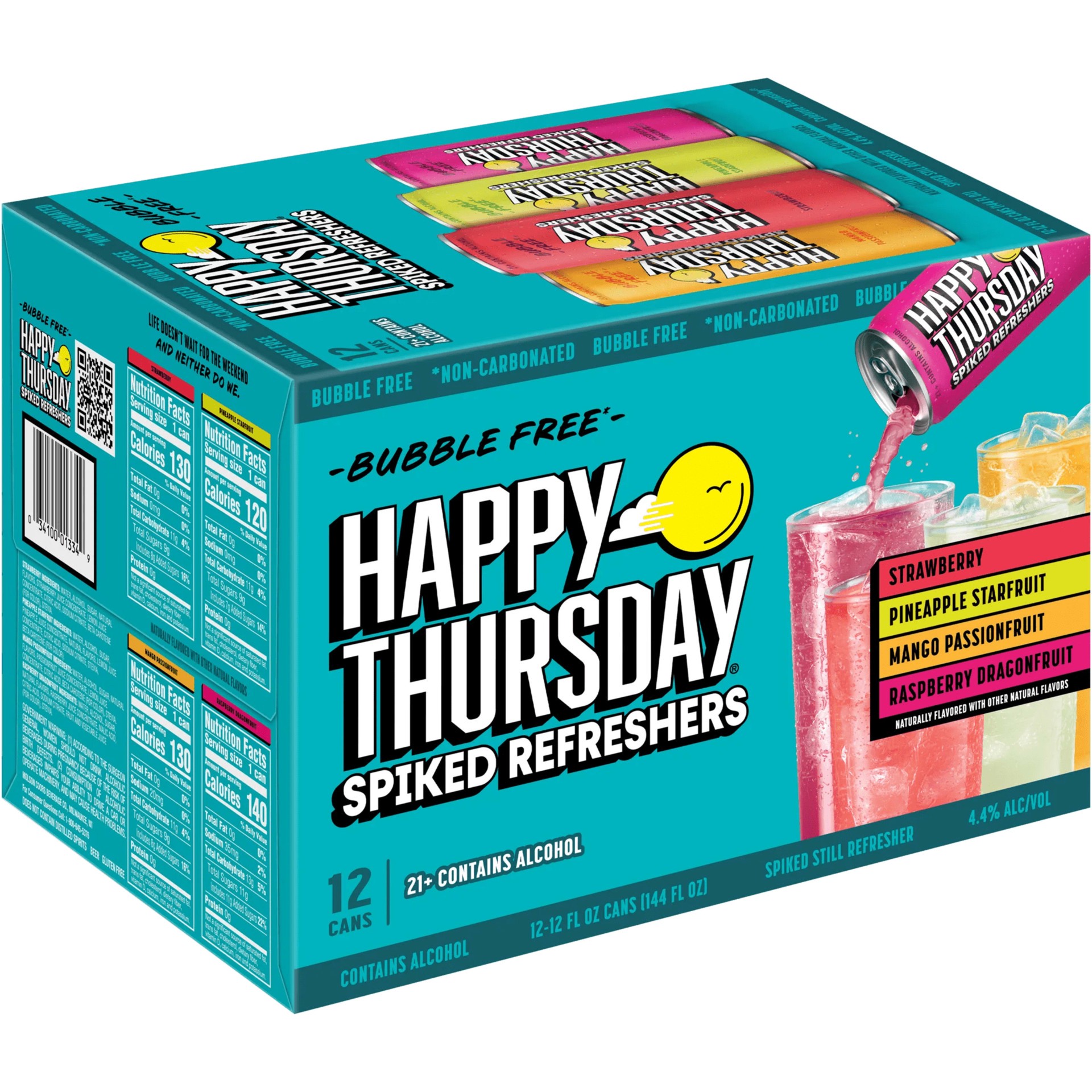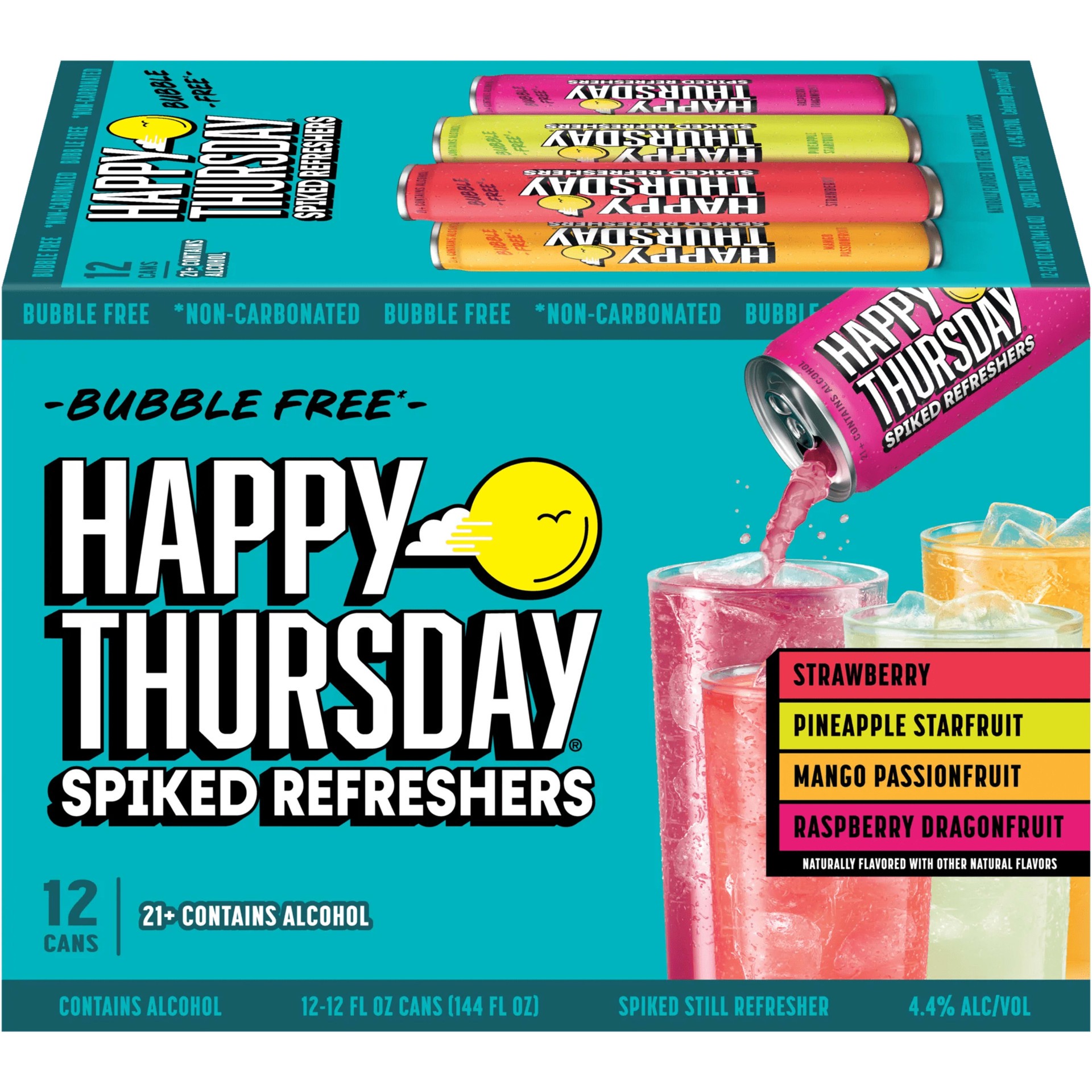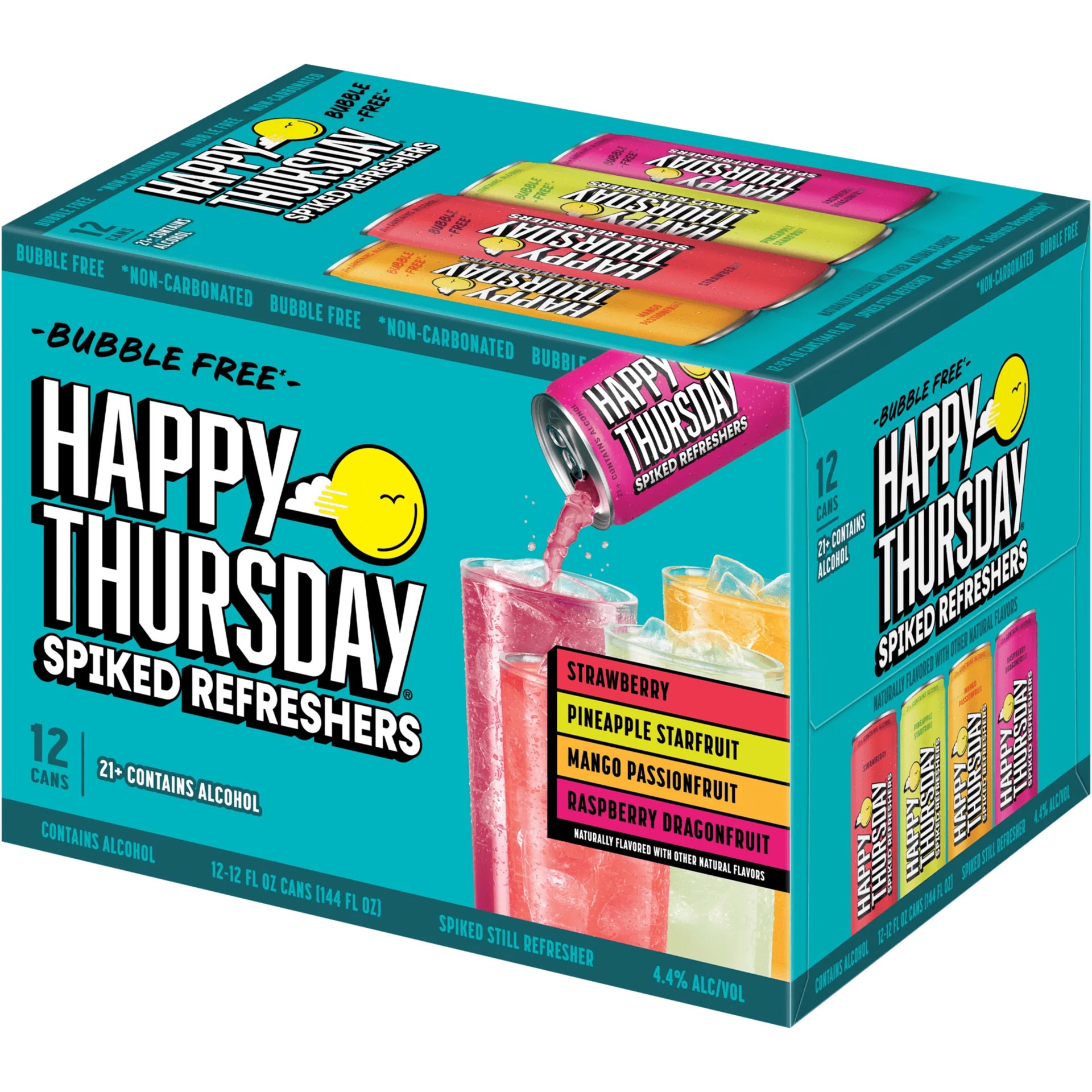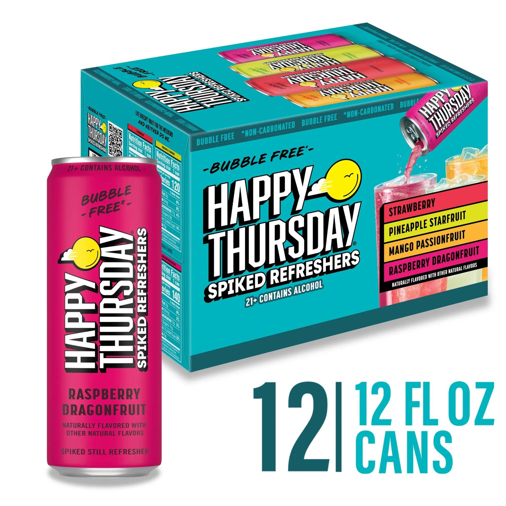 - 12 pack of 12 fl oz cans of Happy Thursday Spiked Refreshers Variety Pack