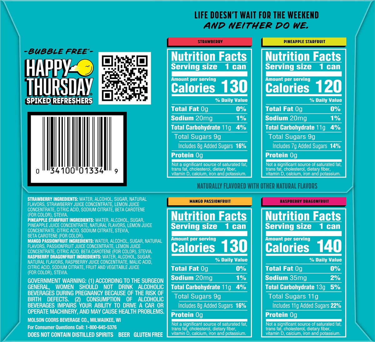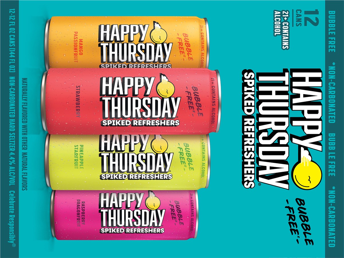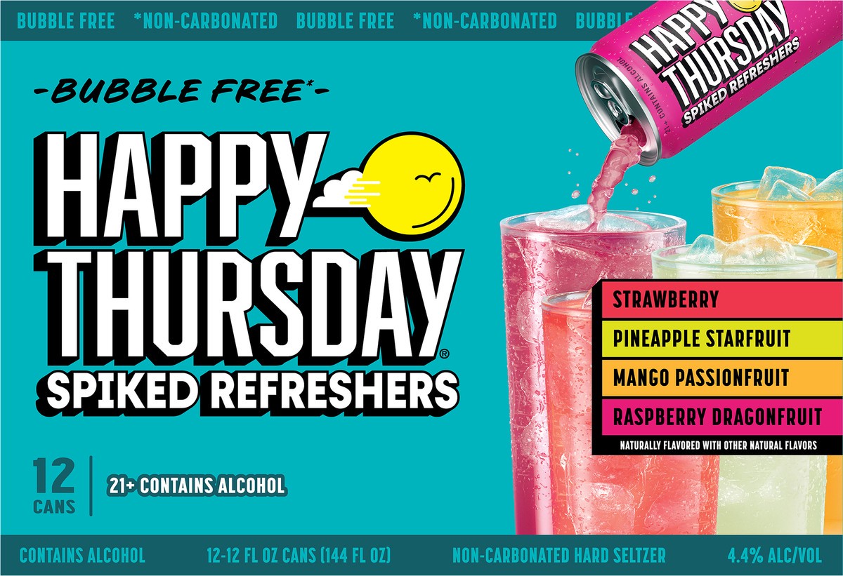 - 12 pack of 12 fl oz cans of Happy Thursday Spiked Refreshers Variety Pack