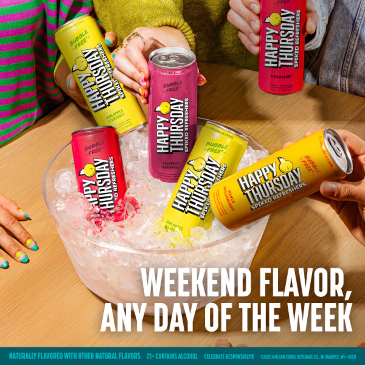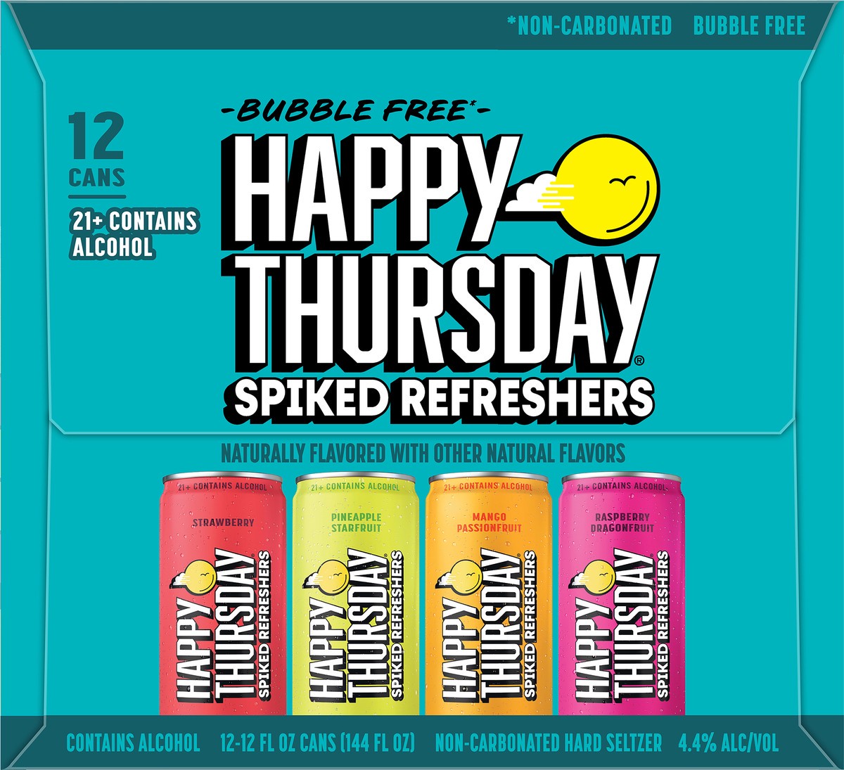 - 12 pack of 12 fl oz cans of Happy Thursday Spiked Refreshers Variety Pack