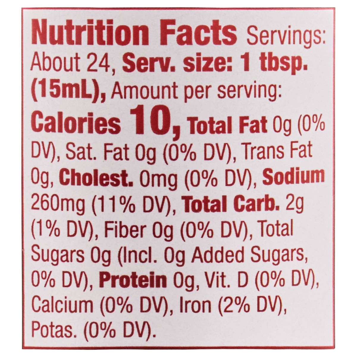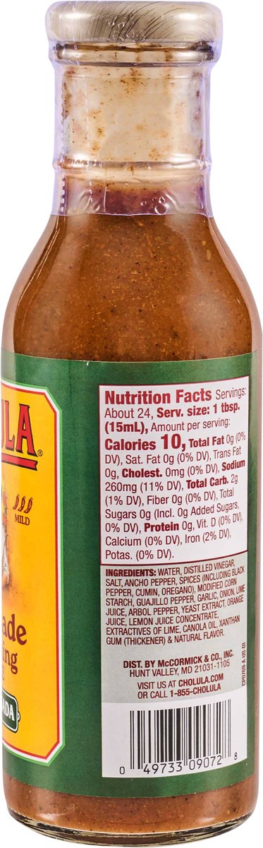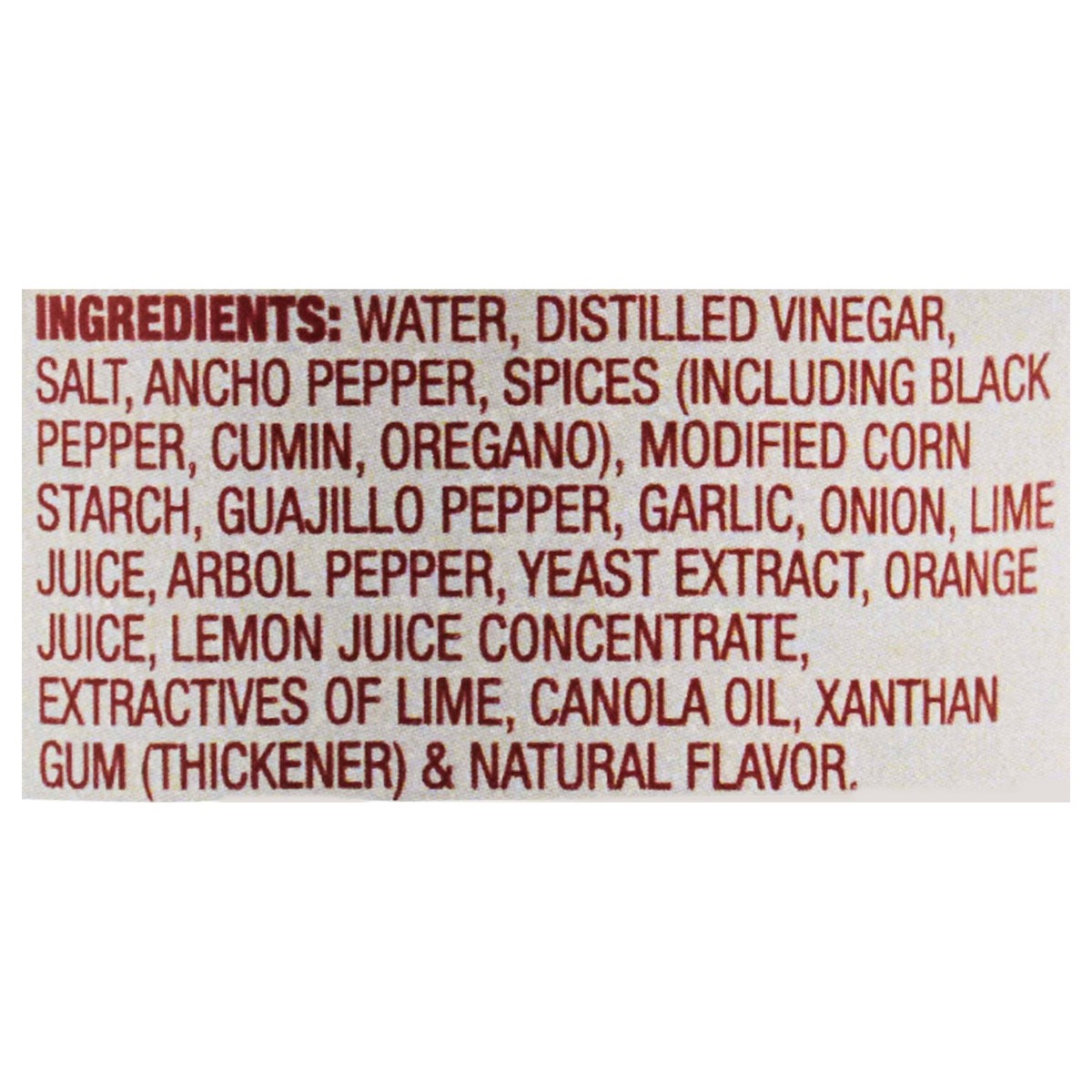 Water, Distilled Vinegar, Salt, Ancho Pepper, Spices (Including Black Pepper, Cumin, Oregano), Modified Corn Starch, Guajillo Pepper, Garlic, Onion, Lime Juice, Arbol Pepper, Yeast Extract, Orange Jui…