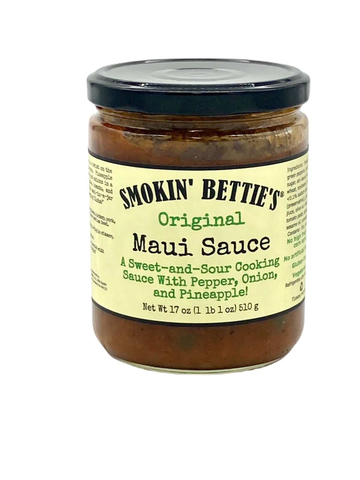 Smokin' Bettie's Maui Sauce is a sweet-and-sour sauce with a twist! Bell peppers, onions, and pineapple chunks float in a sweet sauce of pineapple juice and soy with just a hint of sesame! Brown one p…
