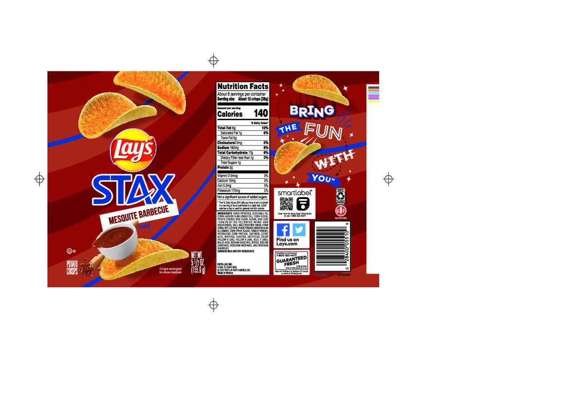 Lay's Stax are the ultimate way to recharge! Lay's Stax Mesquite BBQ flavored potato crisps give you the full flavor and crispy crunch that acids great taste to your busy clay. Enjoy Lay's Stax crisps…