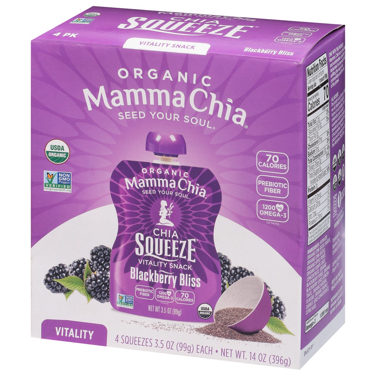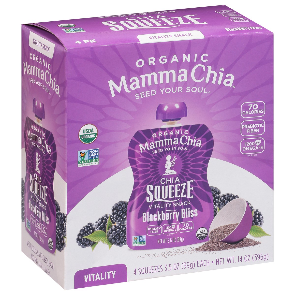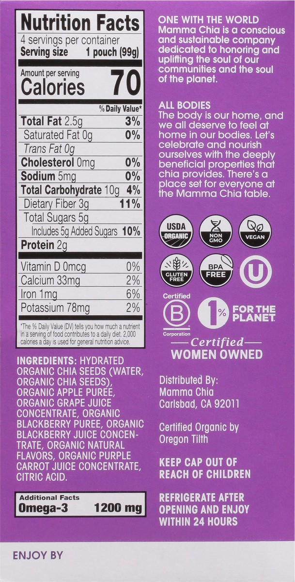 Mamma Chia Chia Squeeze Organic Blackberry Bliss Vitality Snack - 4 x 3.5 oz Pouches