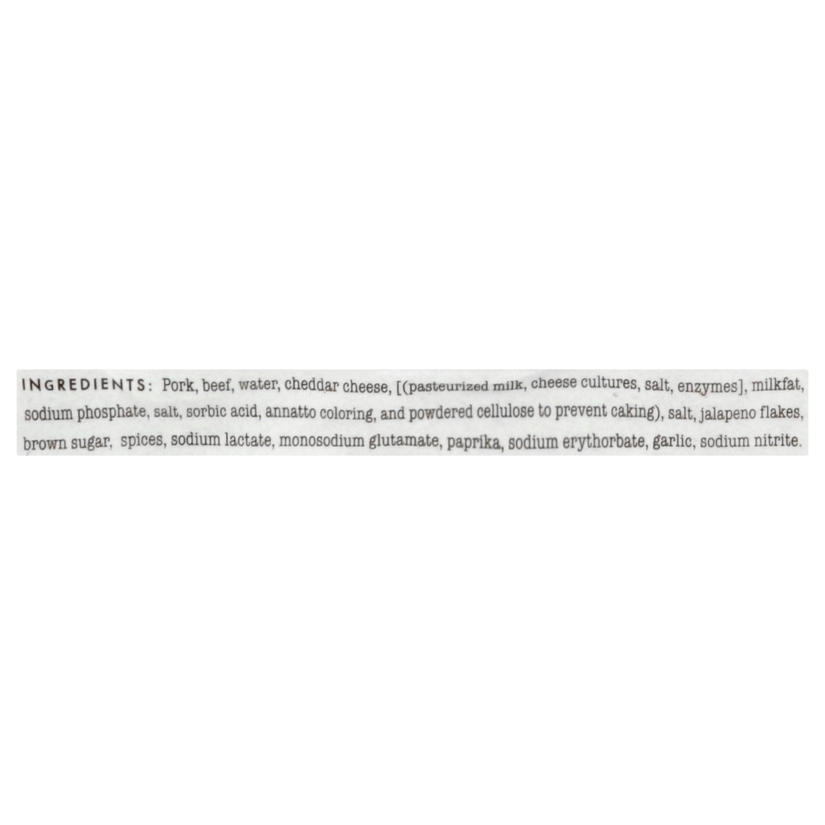 Pork, Beef, Water, Cheddar Cheese, [(Pasteurized Milk, Cheese Cultures, Salt, Enzymes], Milkfat, Sodium Phosphate, Salt, Sorbic Acid, Annatto Coloring, and Powdered Cellulose to Prevent Caking), Salt,…