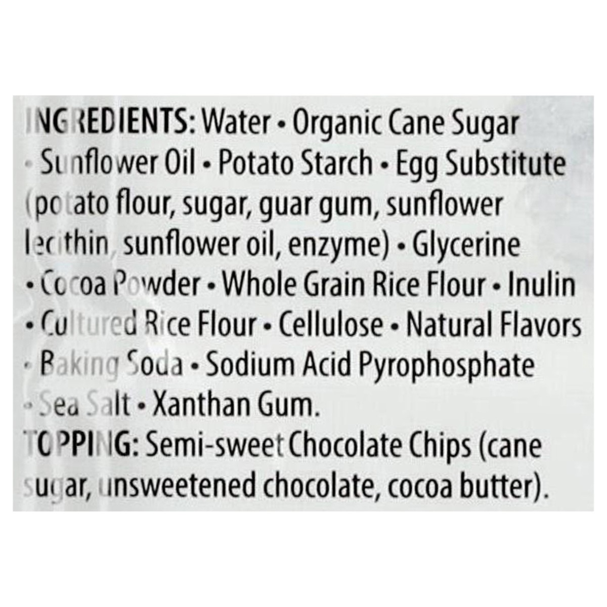 Water, Organic Cane Sugar, Sunflower Oil, Potato Starch, Egg Substitute (Potato Flour, Sugar, Guar Gum, Sunflower Lecithin, Sunflower Oil, Enzyme), Glycerine, Cocoa Powder, Whole Grain Rice Flour, Inu…