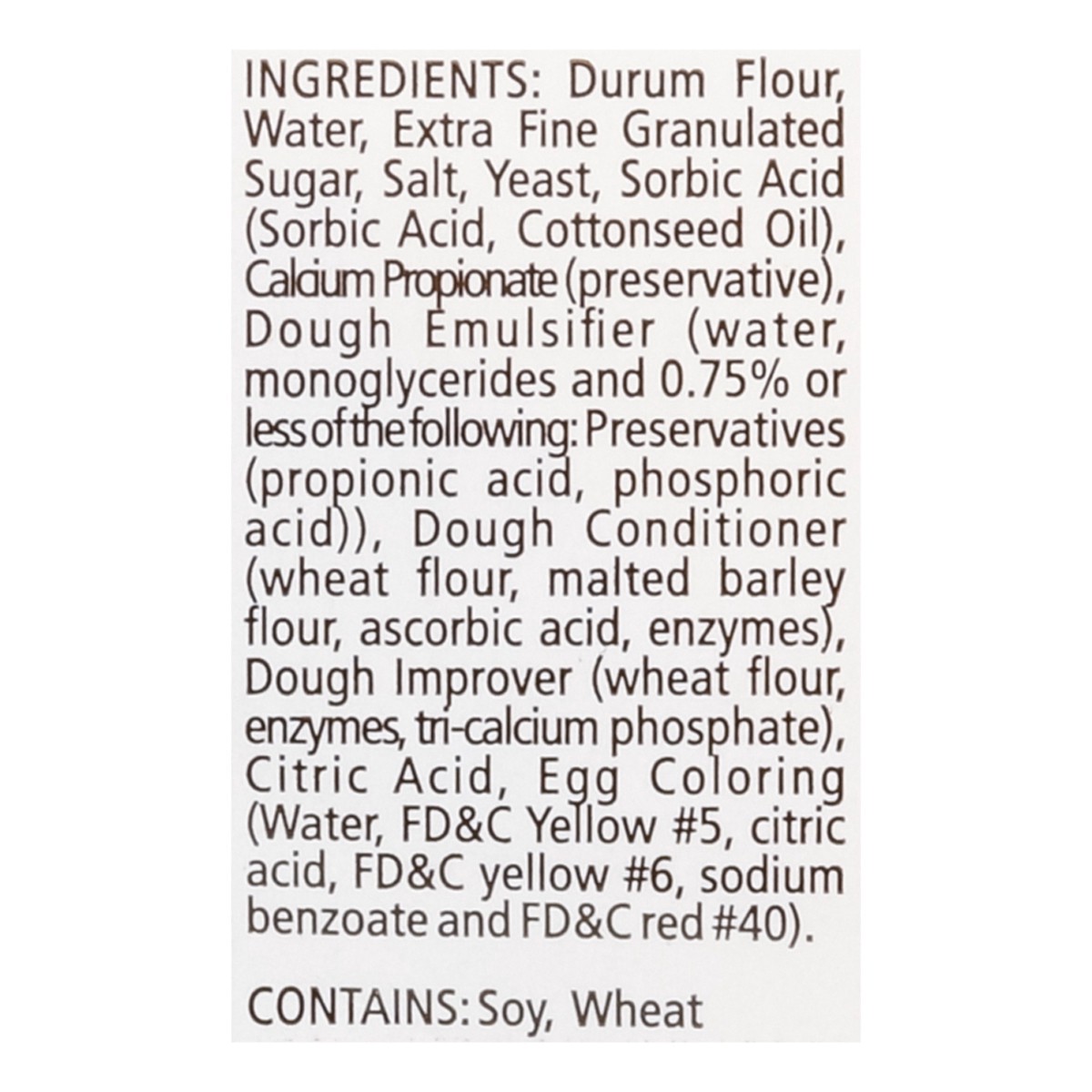 Durum Flour Water, Extra Fine Granulated Sugar, Salt, Yeast, Sorbic Acid (Sorbic Acid, Cottonseed Oil), Calcium Propionate (Preservative), Dough Emulsifier (Water, Monoglycerides and 0.75% or Less of …