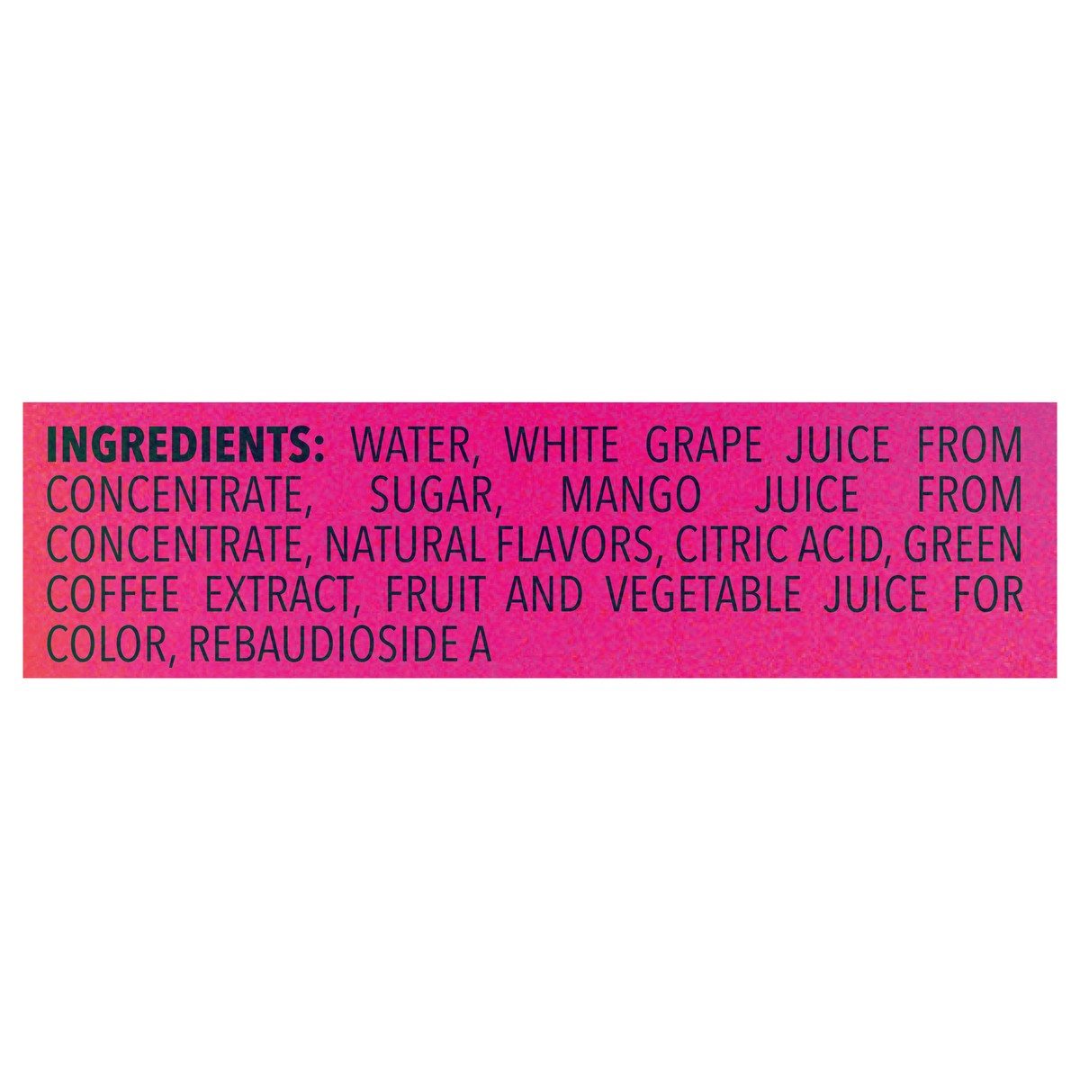 Water, White Grape Juice from Concentrate, Sugar, Mango Juice from Concentrate, Natural Flavors, Citric Acid, Green Coffee Extract, Fruit and Vegetable Juice for Color, Rebaudioside A.