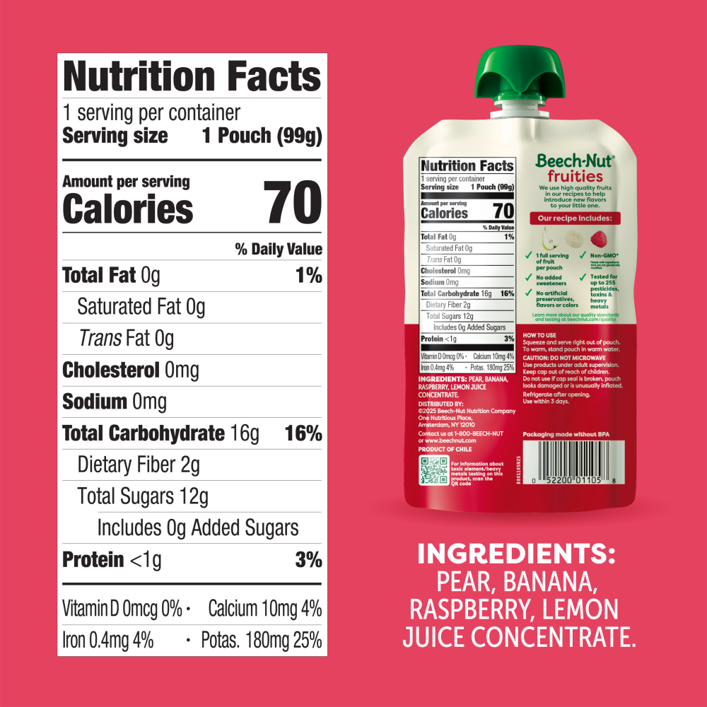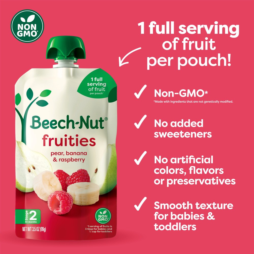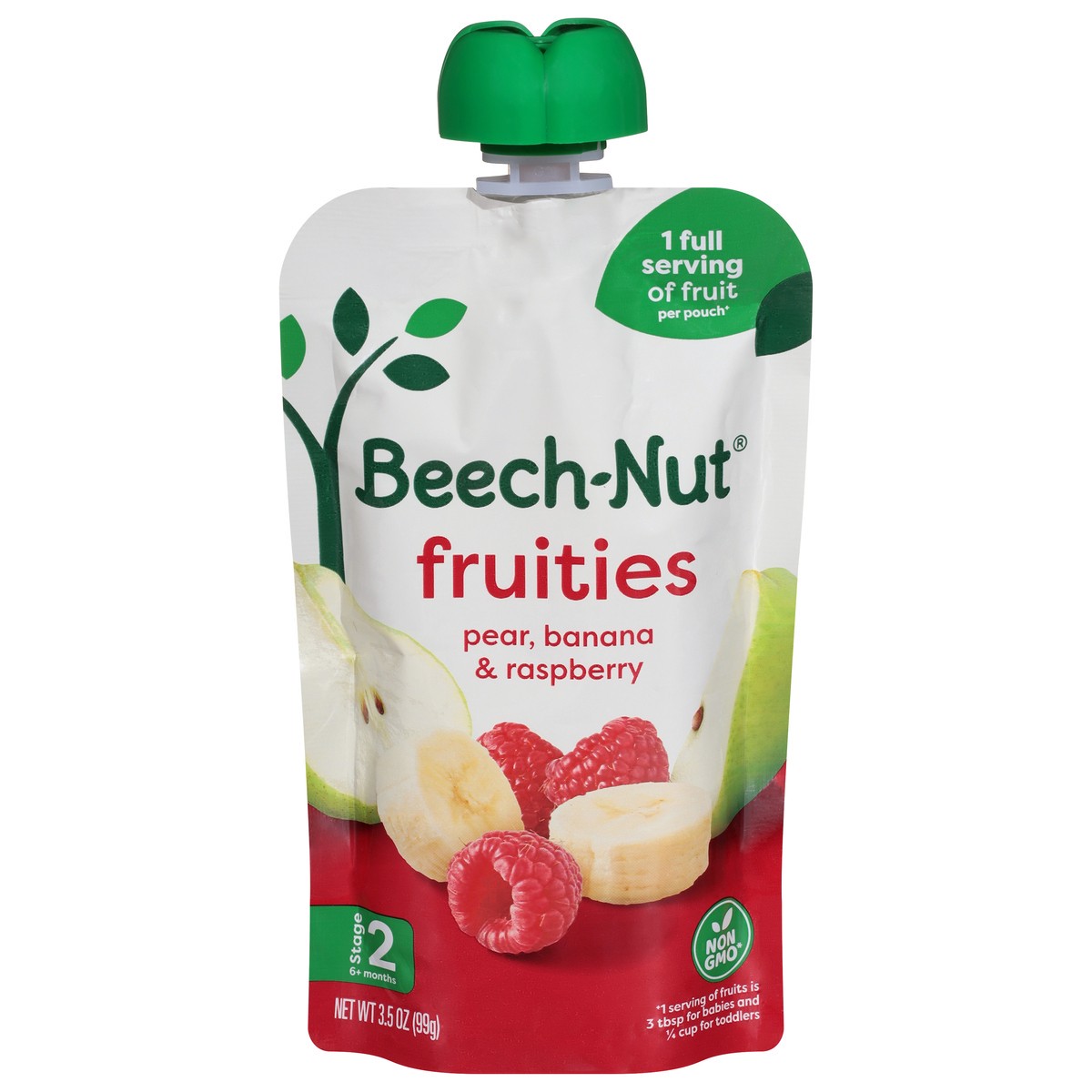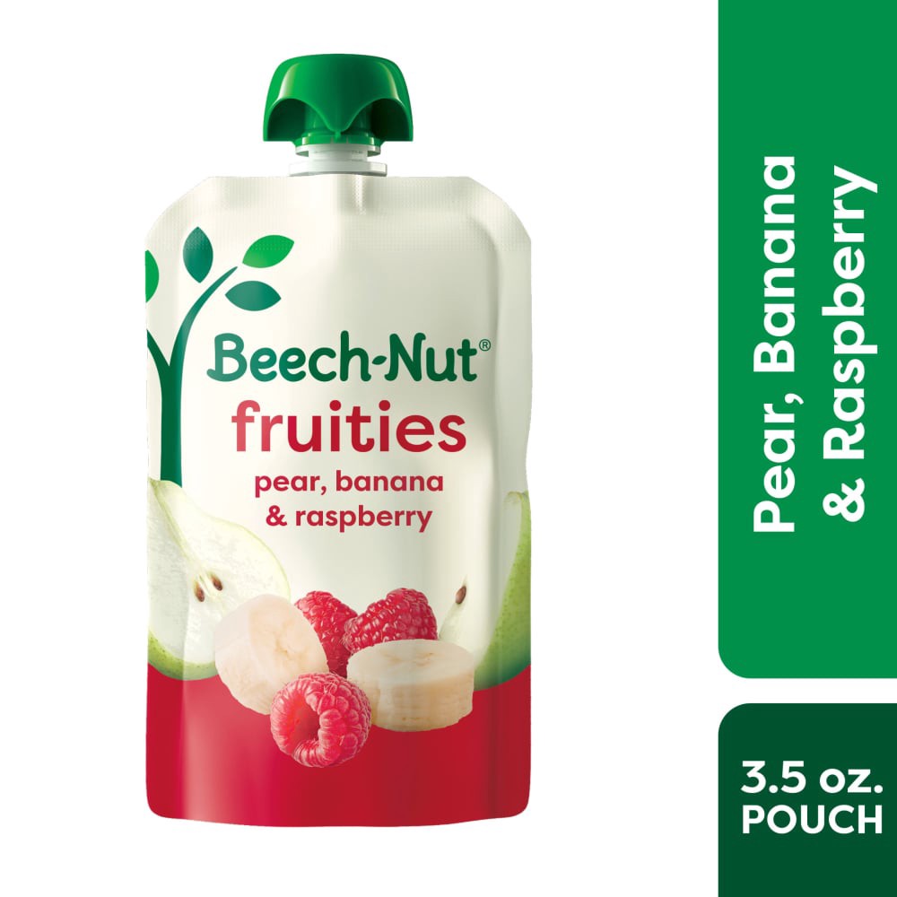 Beech-Nut Baby and Toddler Food Pouches are made with real ingredients and packed in convenient pouches for on-the-go feeding. Our fruities blend contains pear, banana and raspberries--great for intro…