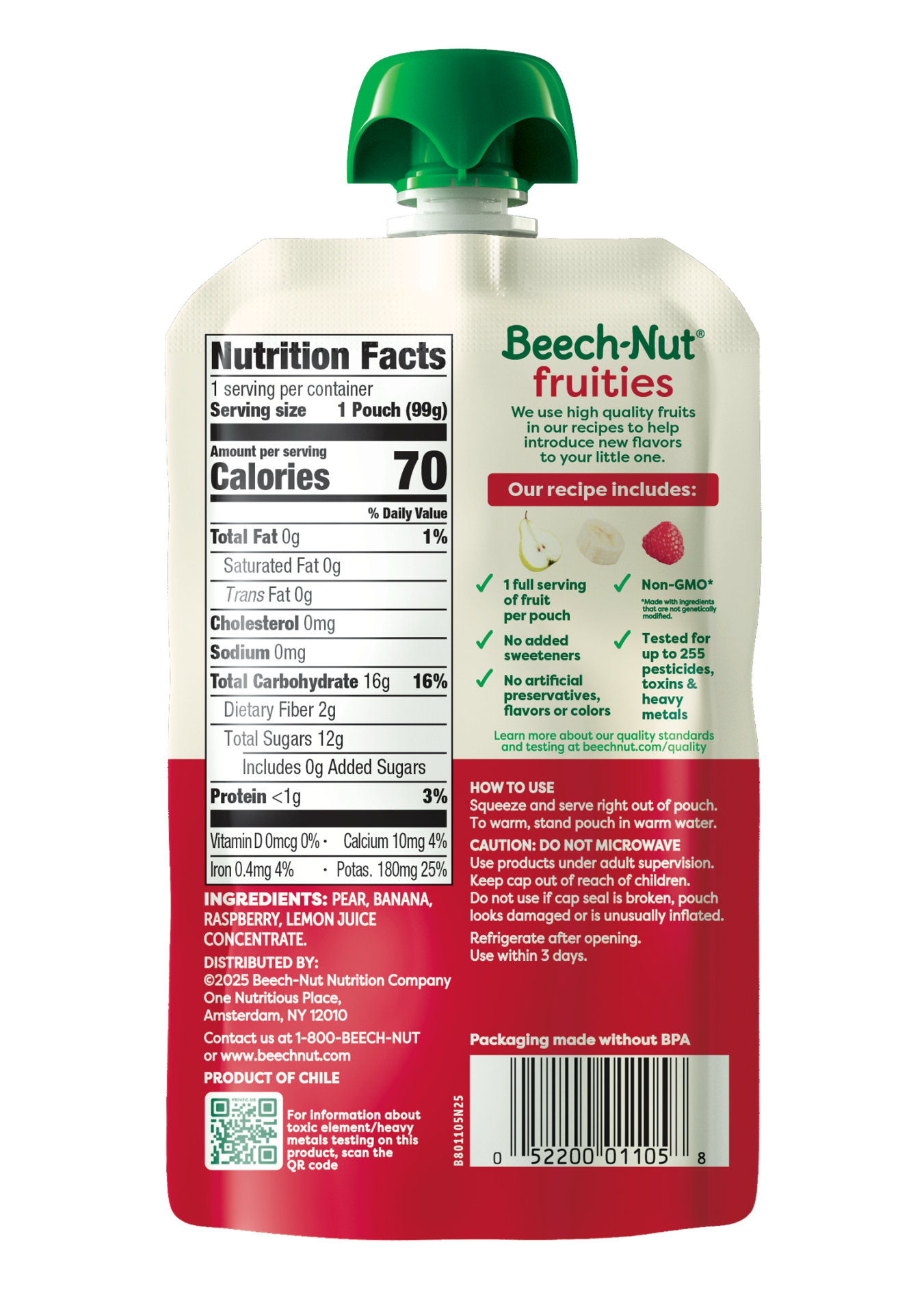 Beech-Nut Baby and Toddler Food Pouches are made with real ingredients and packed in convenient pouches for on-the-go feeding. Our fruities blend contains pear, banana and raspberries--great for intro…