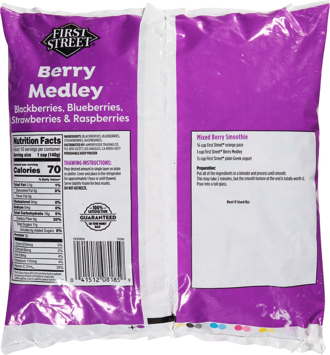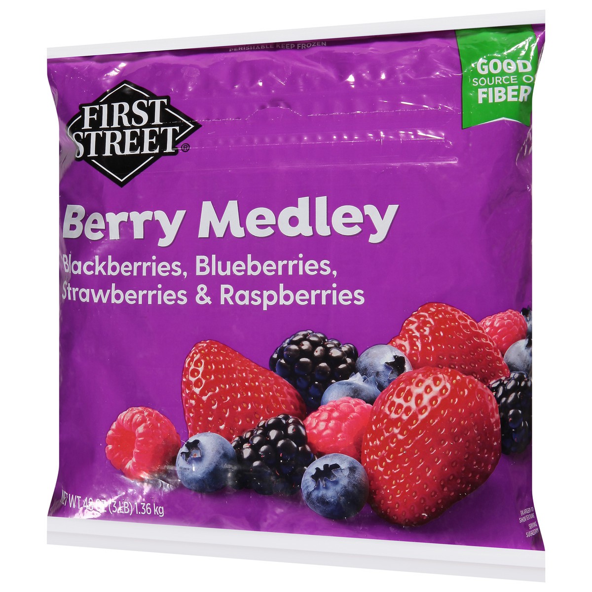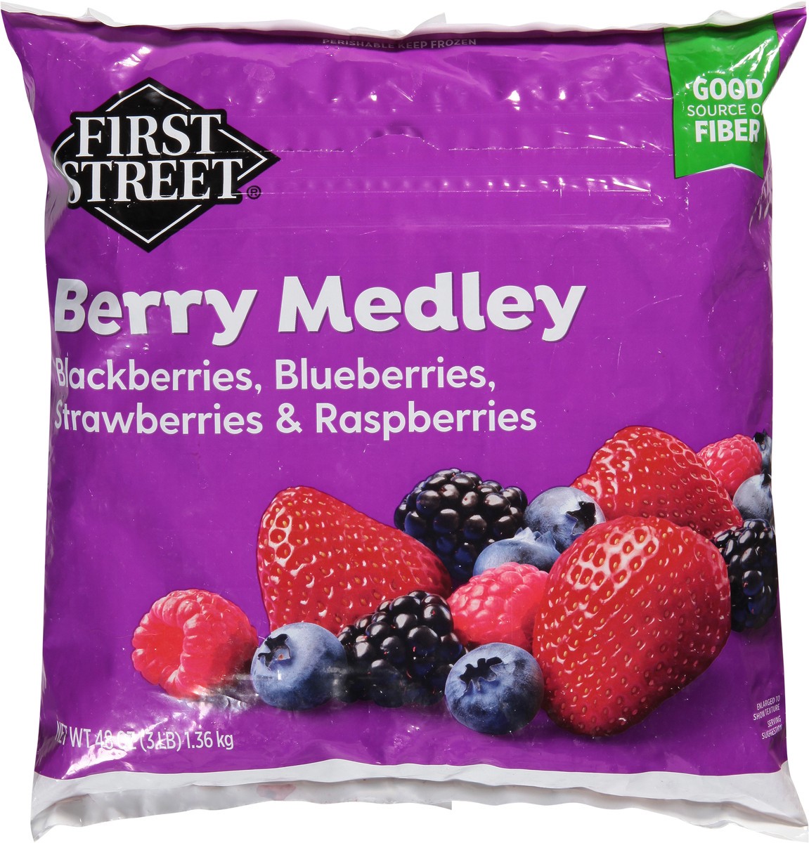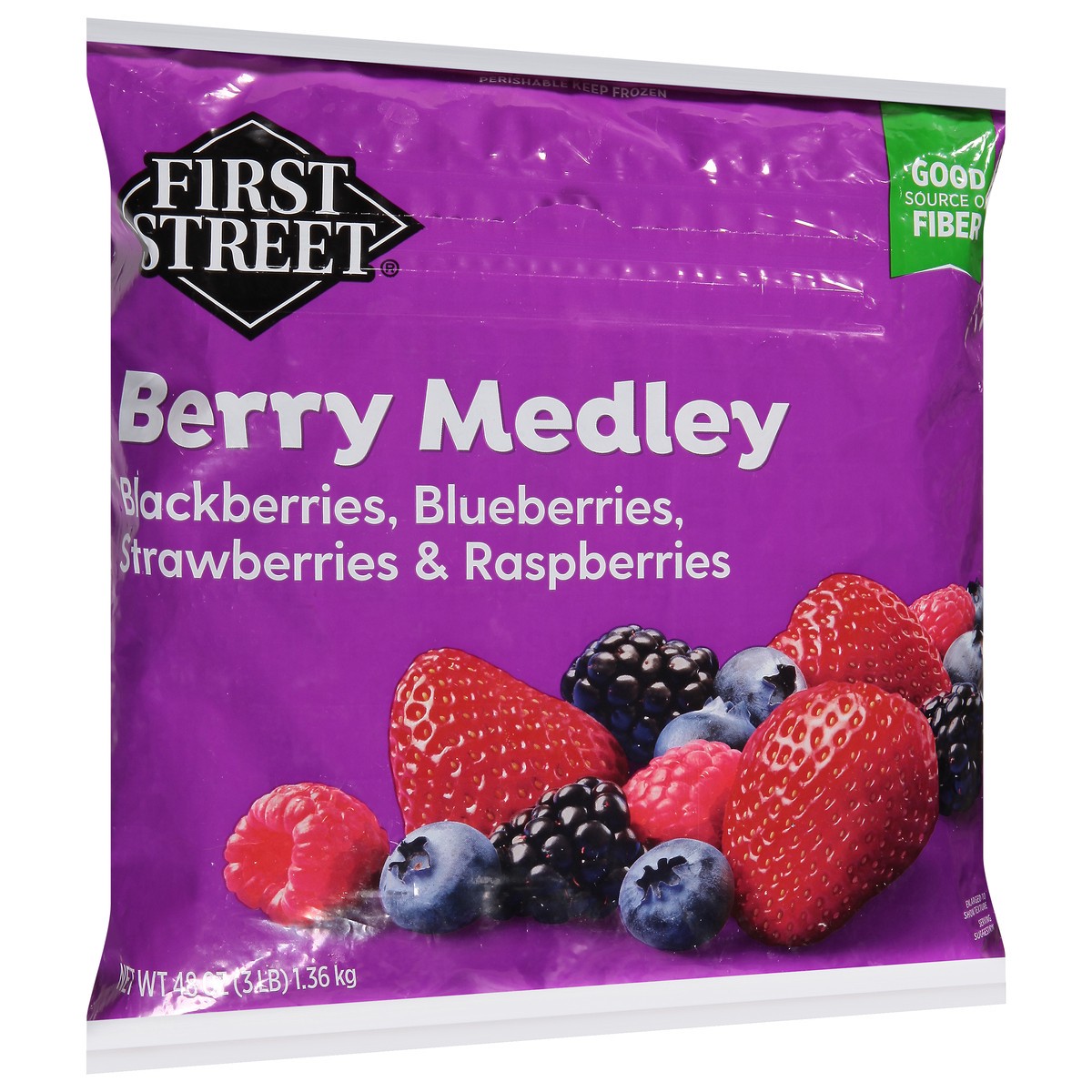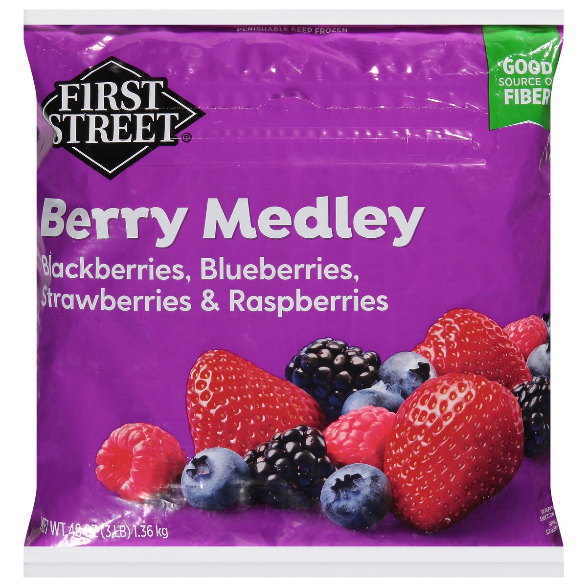 First Street Berry Medley, Berry blast. First Street Berry Medley combines strawberries, blackberries, blueberries, and raspberries. A colorful, antioxidant-rich mix perfect for smoothies or baking.