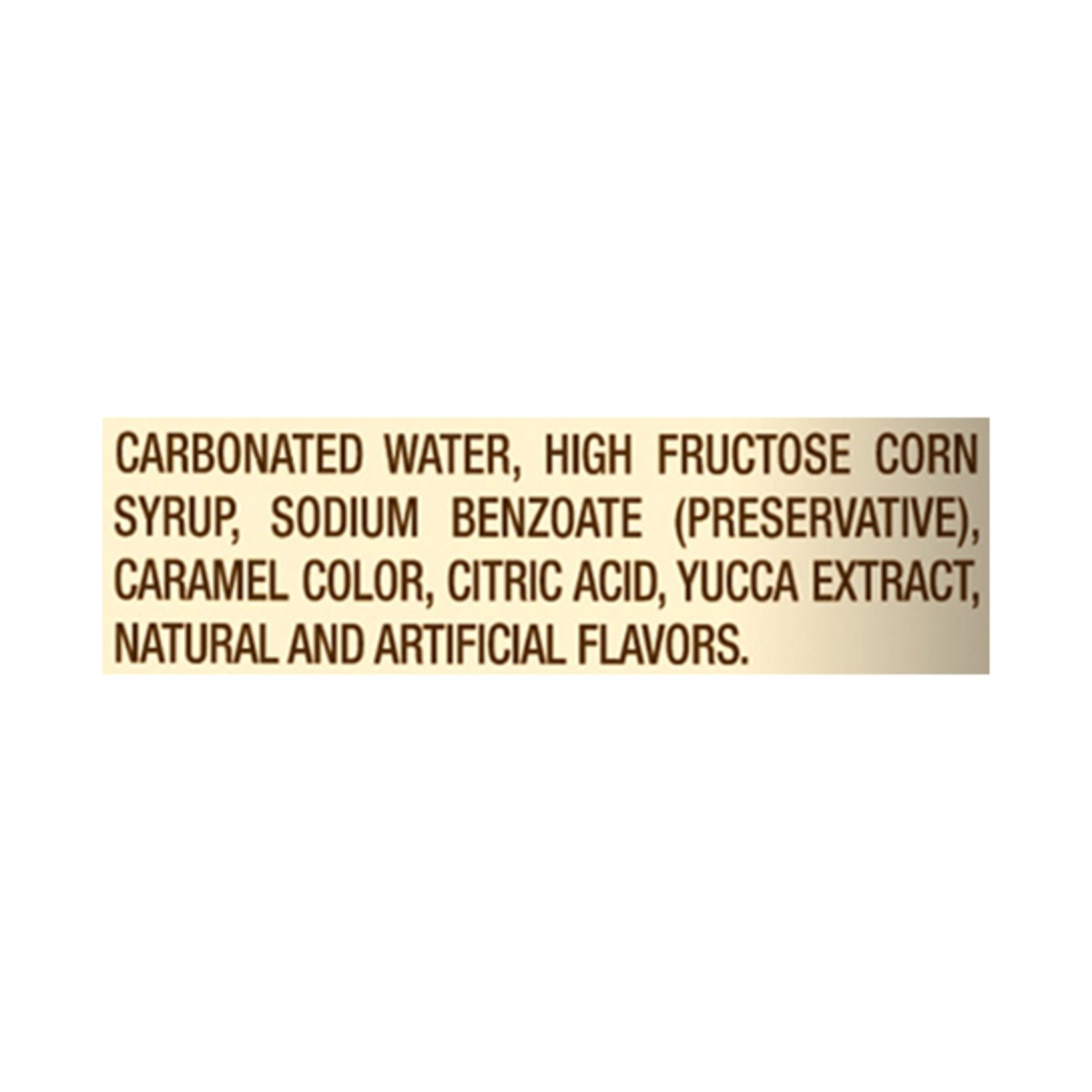 Carbonated Water, High Fructose Corn Syrup, Sodium Benzoate (Preservative), Caramel Color, Citric Acid, Yucca Extract, Natural and Artificial Flavors.