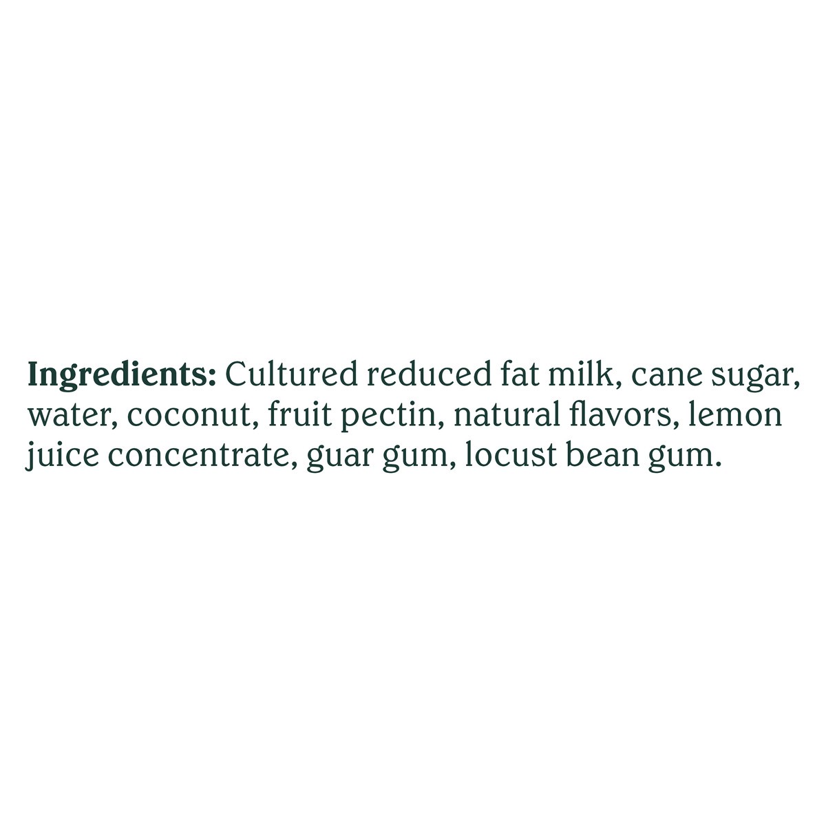 Cultured Reduced Fat Milk, Cane Sugar, Water, Coconut, Fruit Pectin, Natural Flavors, Lemon Juice Concentrate, Guar Gum, Locust Bean Gum. 6 Live and Active Cultures: S. Thermophilus, L. Bulgaricus, L.…