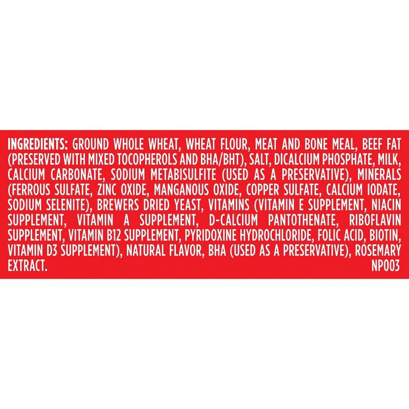 Ground Whole Wheat, Wheat Flour, Meat and Bone Meal, Beef Fat (Preserved with Mixed Tocopherols and BHA/BHT), Salt, Dicalcium Phosphate, Milk, Calcium Carbonate, Sodium Metabisulfite (Used as a Preser…