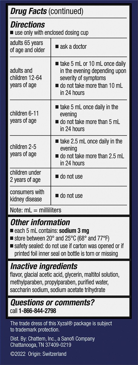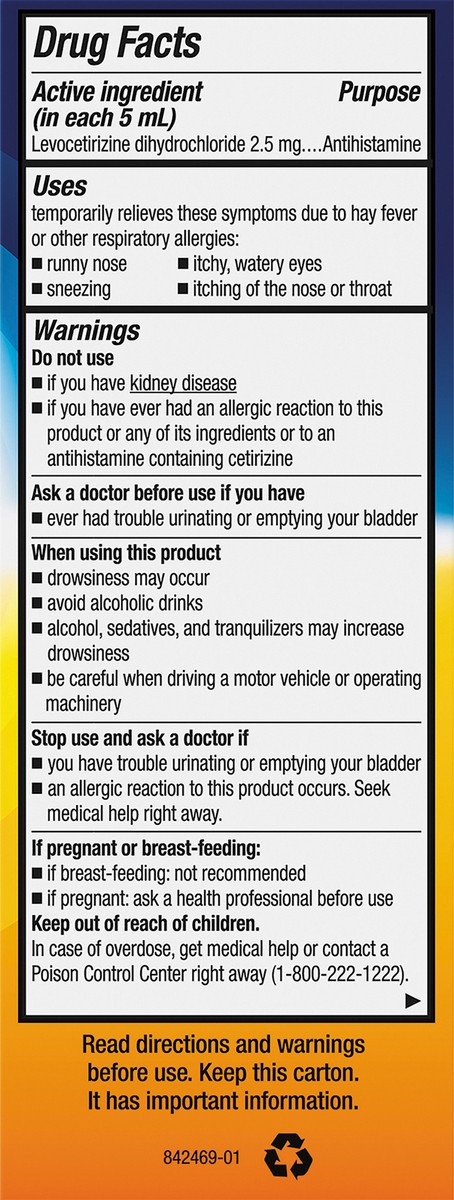 In Each 5 mL: Active Ingredients: Levocetirizine Dihydrochloride (2.5 mg), Antihistamine. Inactive Ingredients: Flavor, Glacial Acetic Acid, Glycerin, Maltitol Solution, Methylparaben, Propylparaben, …