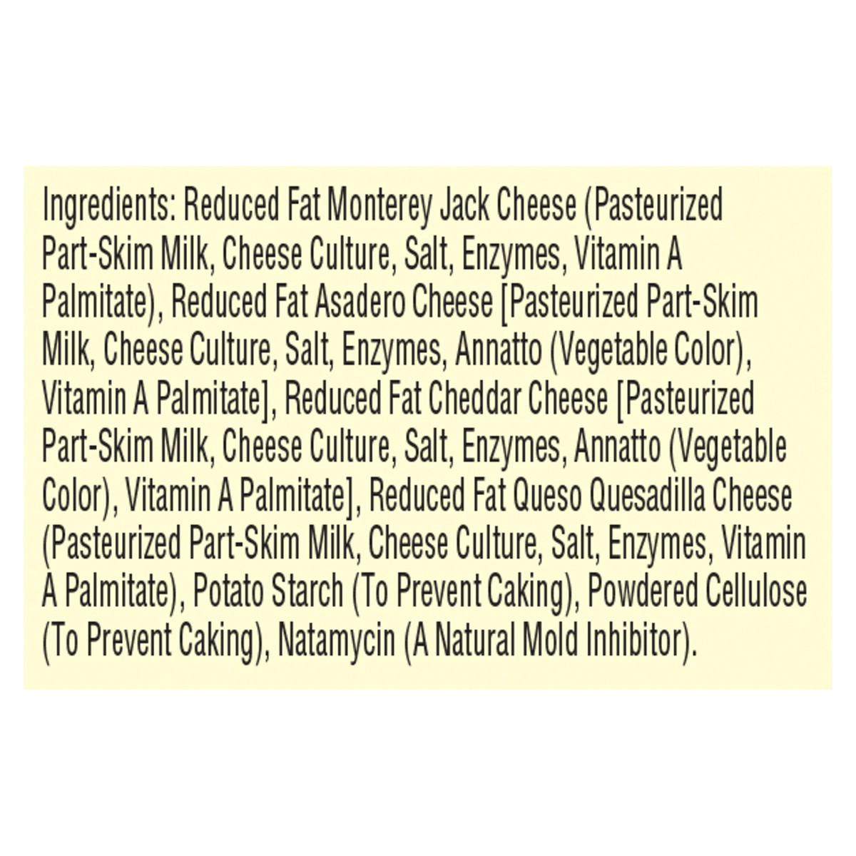 REDUCED FAT MONTEREY JACK CHEESE (PASTEURIZED REDUCED FAT MILK, CHEESE CULTURE, SALT, ENZYMES, VITAMIN A PALMITATE), REDUCED FAT QUESO QUESADILLA CHEESE (PASTEURIZED REDUCED FAT MILK, CHEESE CULTURE, …